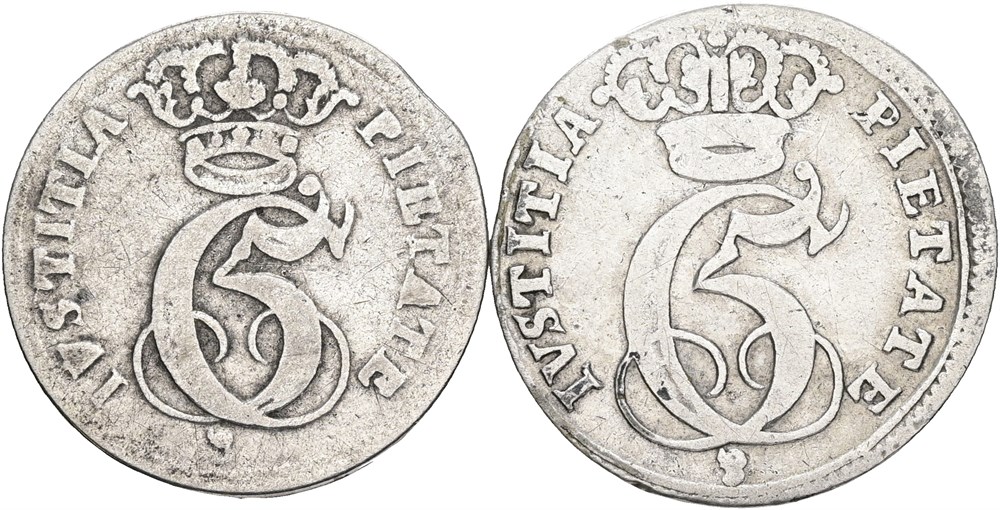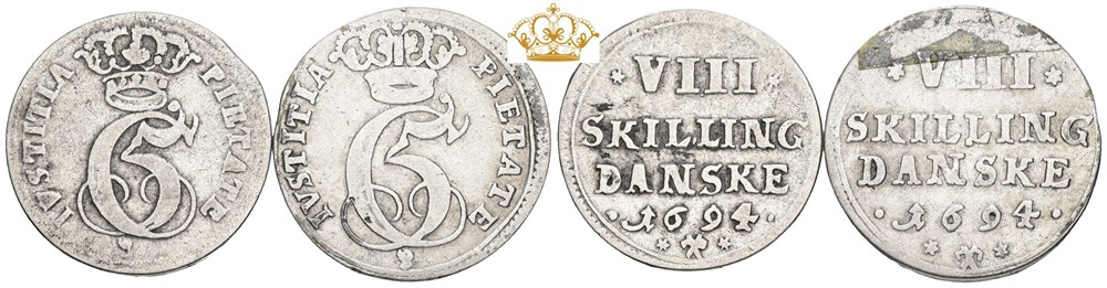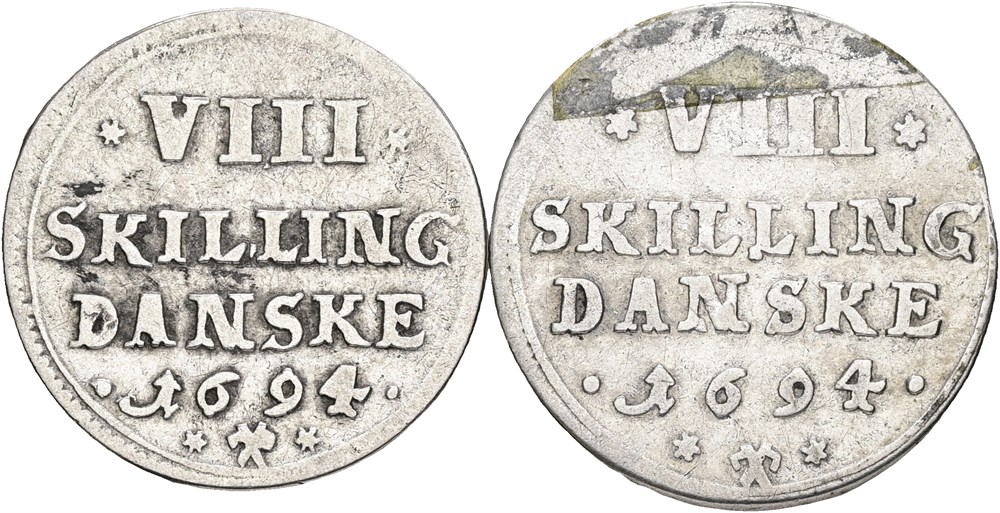 8 skilling 1694, to varianter med henholdsvis lille og stort monogram på lille og stor blanket med lille og stor stempeldiameter. (2)