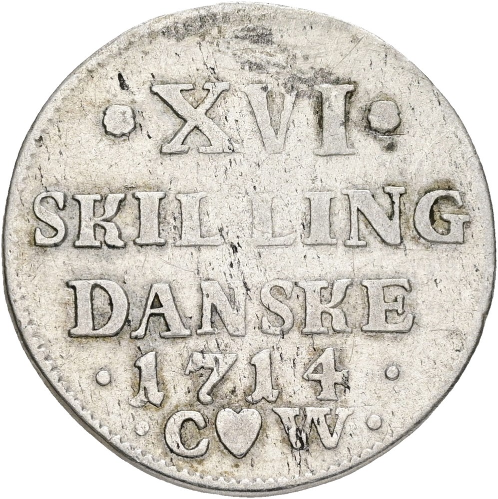 16 skilling 1714, lille loddespor, let renset.