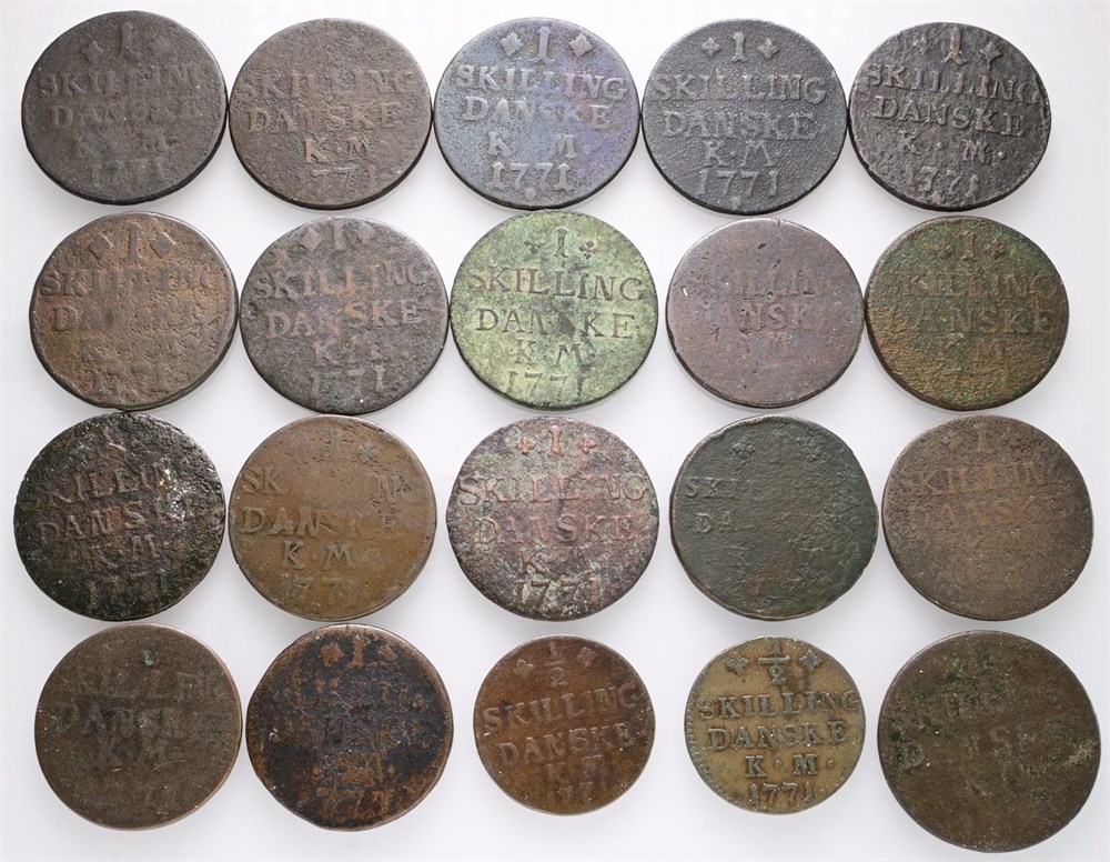 Samling med 1/2 skilling 1771, 2 stk. og 1 skilling 1771, 18 stk. inkl. Schimmelmann-varianten. (20).
