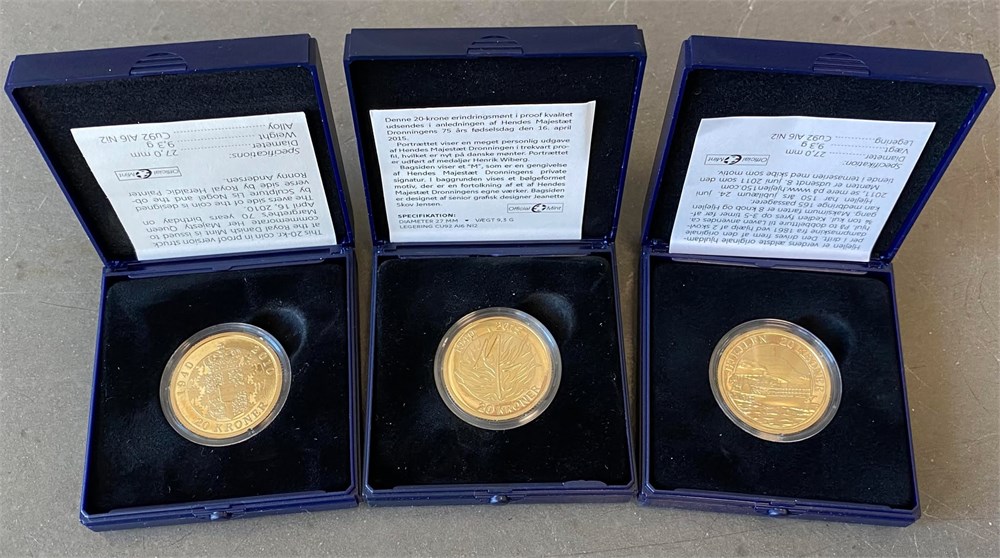 20 kroner 2010, 2011, 2015, 70 års fødselsdag, Hjejlen, 75 års fødselsdag. Alle er i originale kapsler og æsker, samt med certifikater. (3)