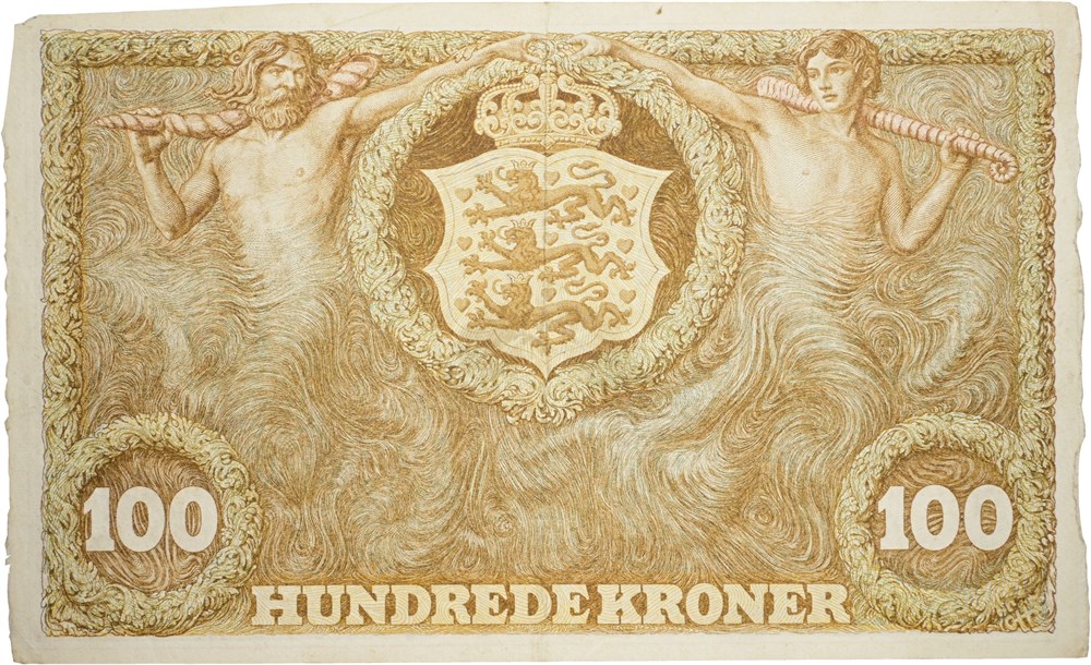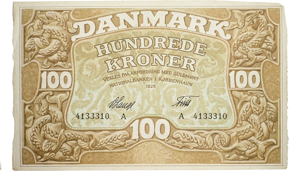 100 kroner 1928 A, nr. 4133310, V. Lange / Friis.