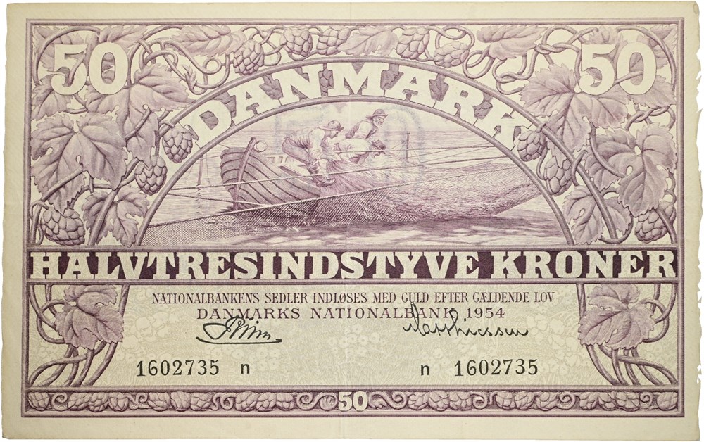 50 kroner 1954 n, nr. 1602735, Riim / Matthiessen.