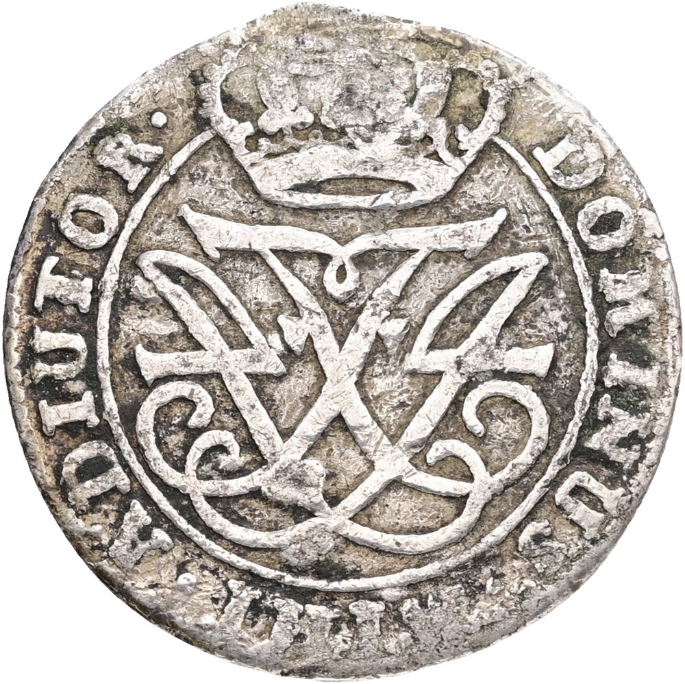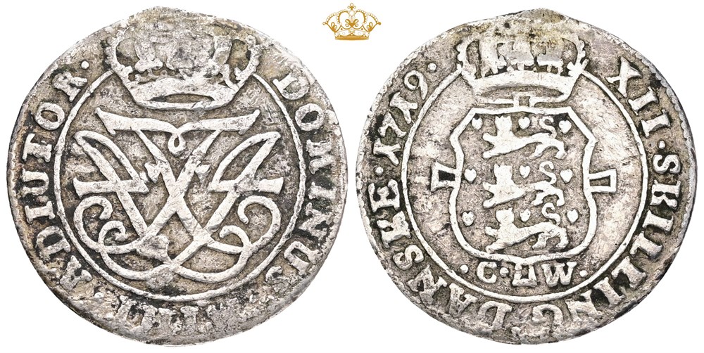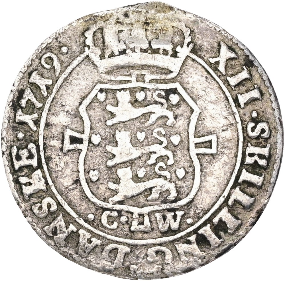 12 skilling 1719, monteringsspor, ridser, let korroderet og renset.