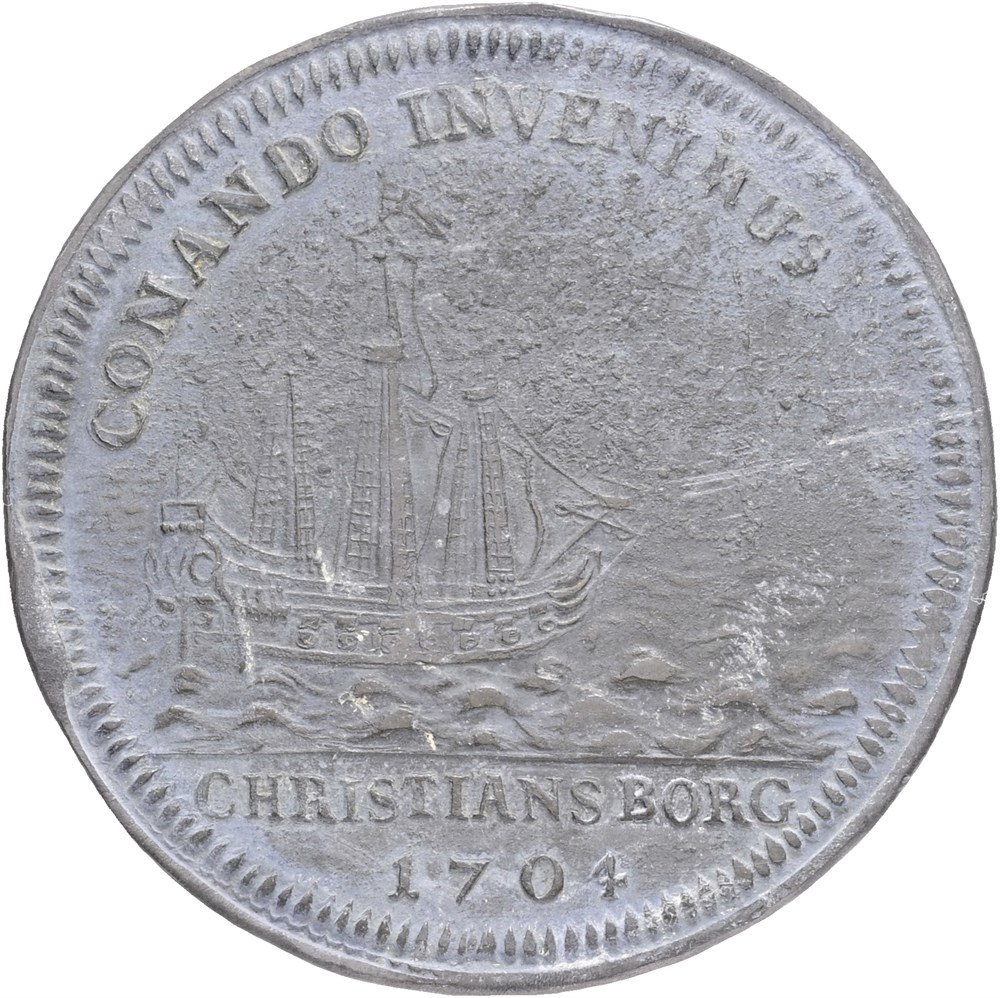 5 dukat 1704, ensidigt afslag af bagsiden i bly, 32 mm.
