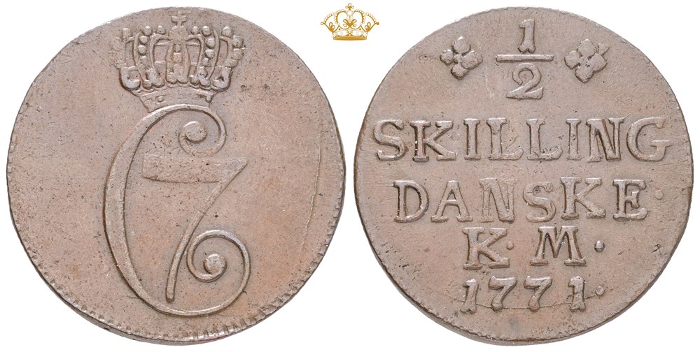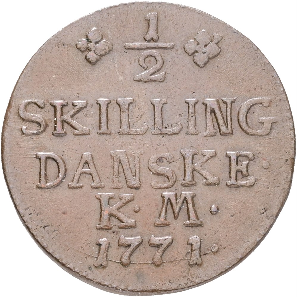 1/2 skilling 1771, udmøntet 1784 i København med stempler skåret af J. Bauert.