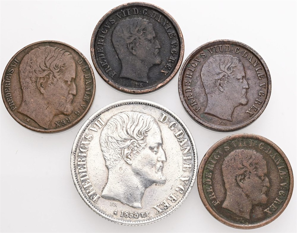 Rigsbankskilling 1852, 1853 (3); rigsdaler 1855. (5)