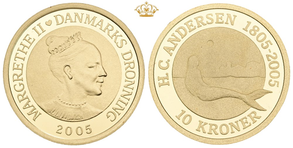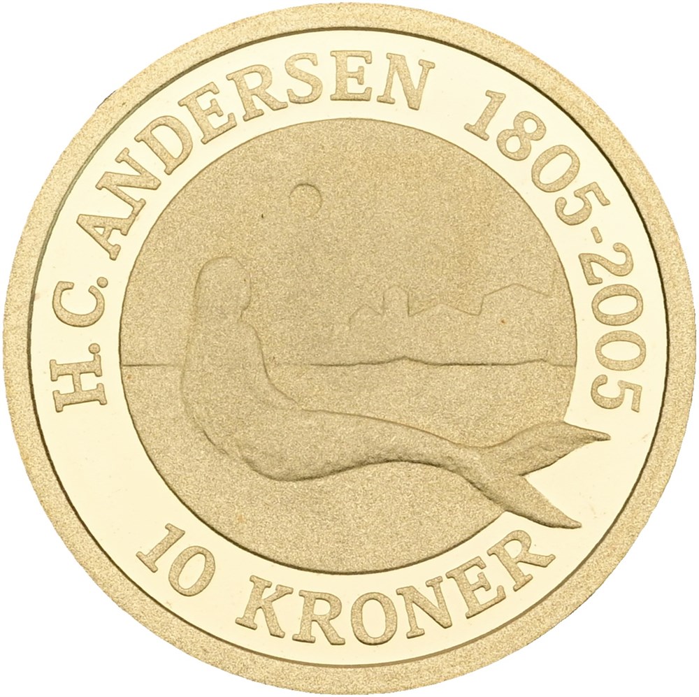 10 kroner 2005, Den Lille Havfrue, H. C. Andersen, Au (900/1000), 8,65 g - i original kapsel og æske, samt med certifikat.