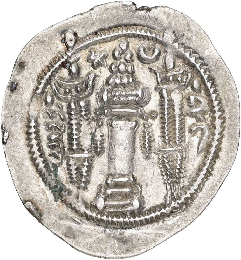 Drachm. Crowned bust right / Fire altar; attendants flanking.