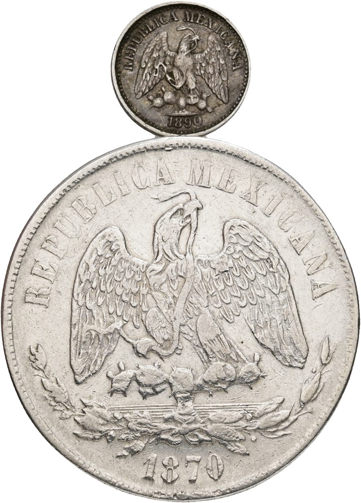 5 Centavos 1890 Cn M, Culiacan Mint, slightly bent; Peso 1870 Pi O, San Luis Potosi Mint, cleaned. (2)