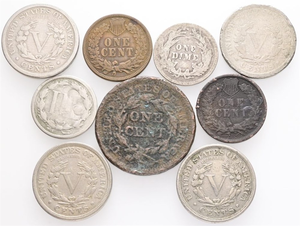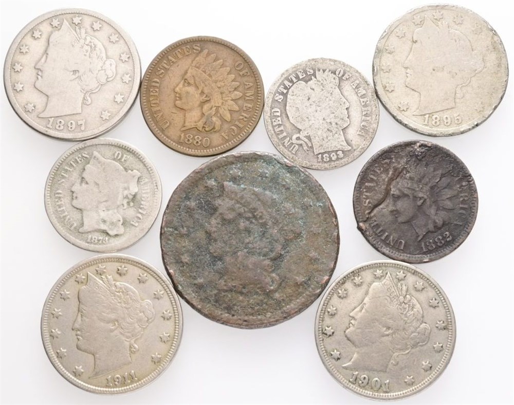 Cent 1845, 1880, 1882; 3 Cents 1873; 5 Cents 1895, 1897, 1901, 1911; Dime 1893. (9)