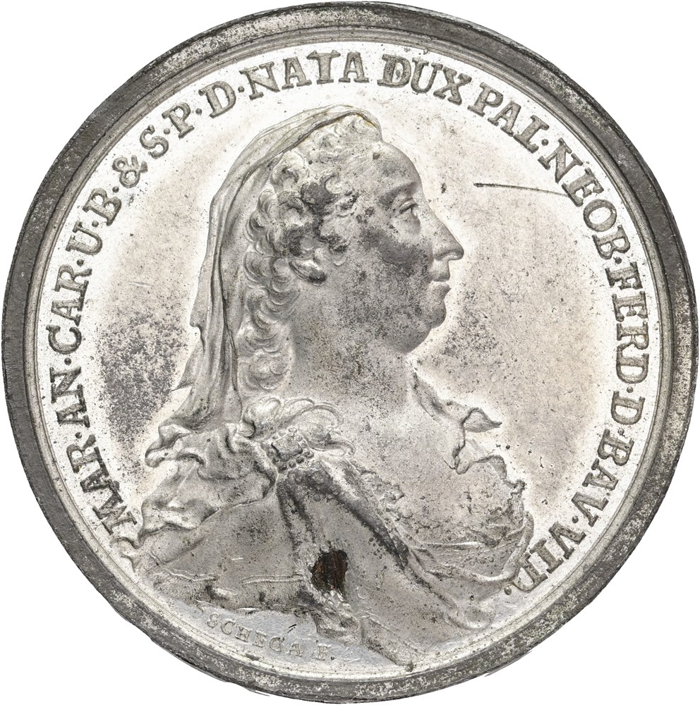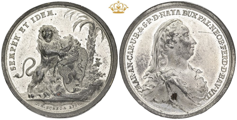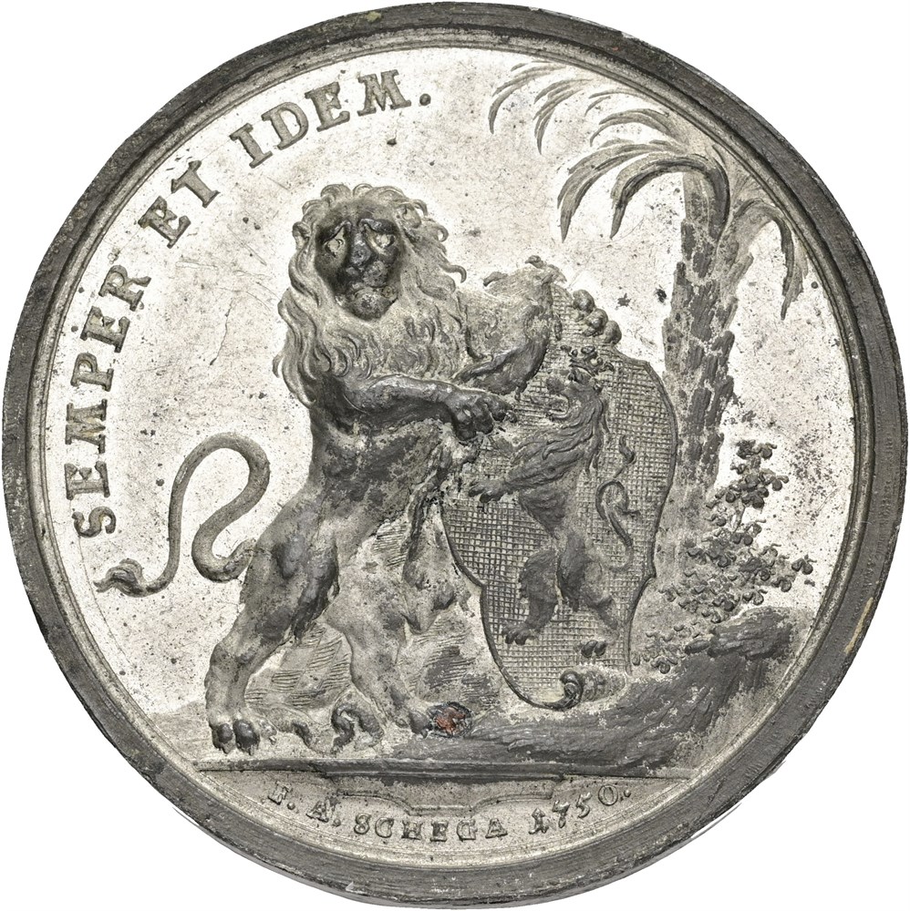 Duchess Maria Anna Karolinas widowhood, 1750, by F.A. Schega, pewter, 44 mm.