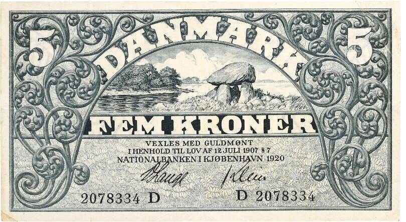 5 kroner 1920 D, nr. 2078334, V. Lange / Klein.