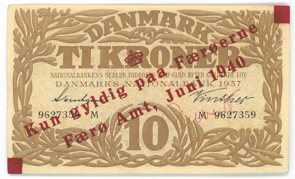 10 kroner 1937 M, nr. 9627359, Svendsen / Vinther, overtrykt "Færø Amt, Juni 1940", med håndskrevet underskrift "Hilbert".