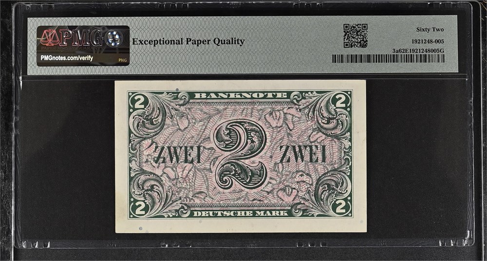 2 Deutsche Mark 1948, Block 52, no. A95613469A - graded Uncirculated 62 EPQ by PMG.