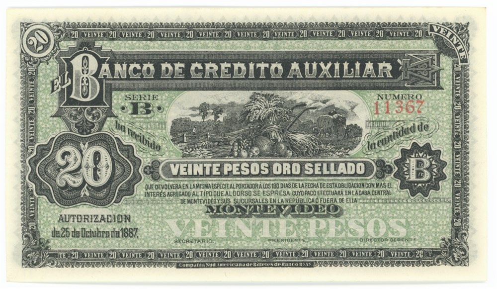 20 Pesos 1887, no. 11367, remainder without signatures.