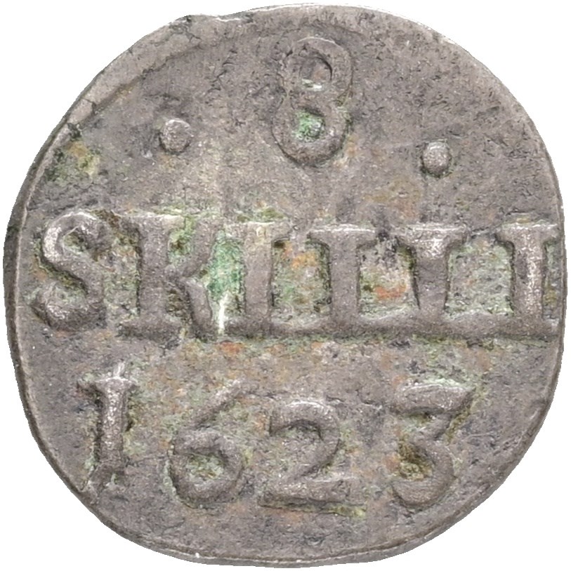 8 skilling 1623, ler korr.