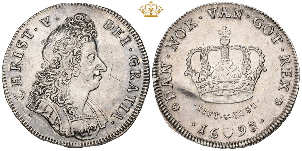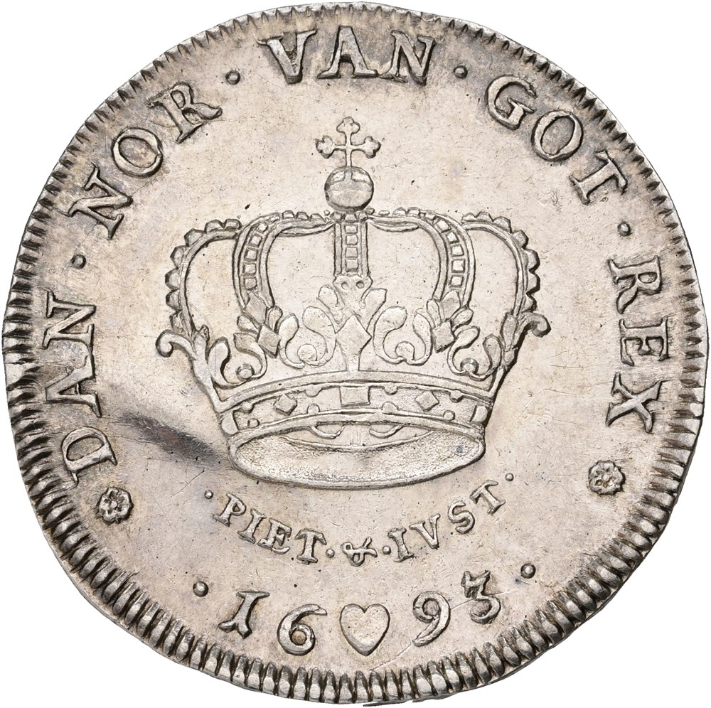 Krone 1693, let renset, ridset på forsiden