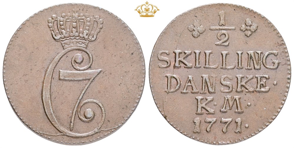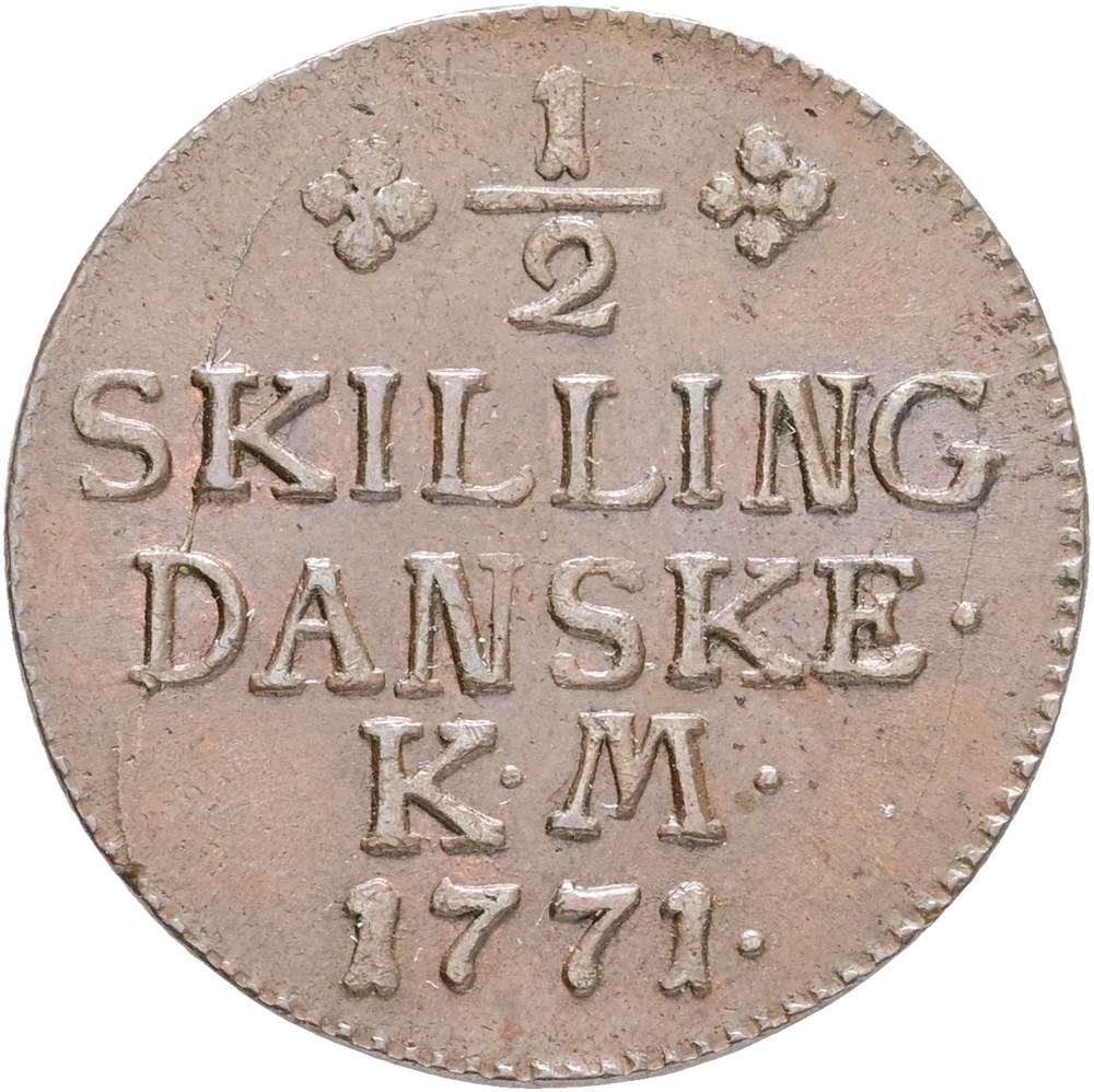 1/2 skilling 1771, udmøntet 1784 i København med stempler skåret af J. Bauert.