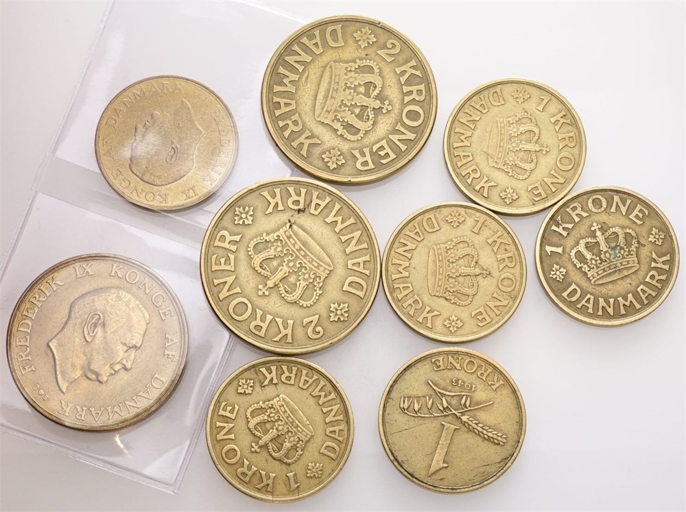 1 krone 1930, 1935, 1938, 1941, 1943, 1959; 2 kroner 1924, 1941, 1959. (9)