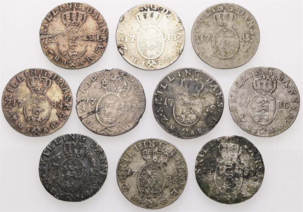 Samling 2 skilling, alle forskellige. (10)