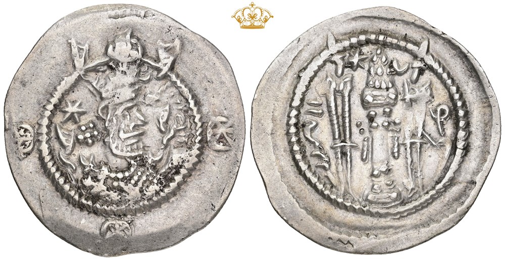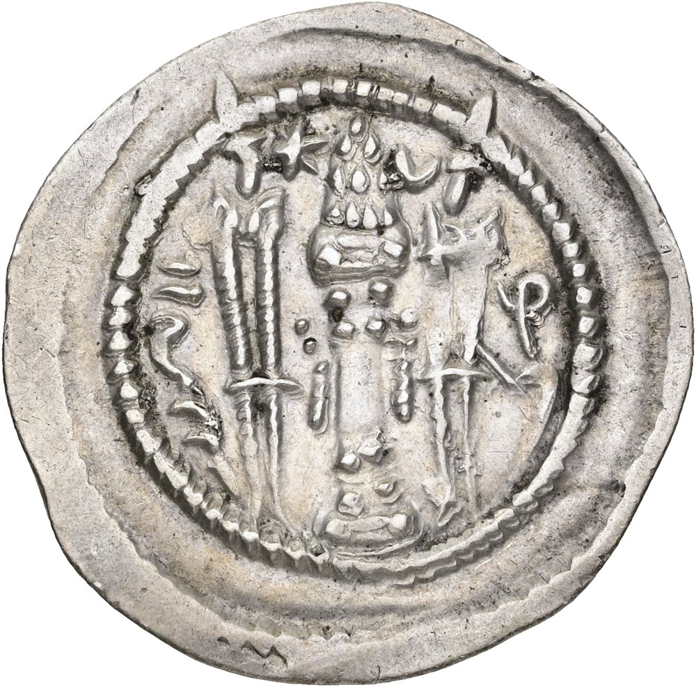 Drachm, year 7. Crowned bust right / Fire altar; attendants flanking.