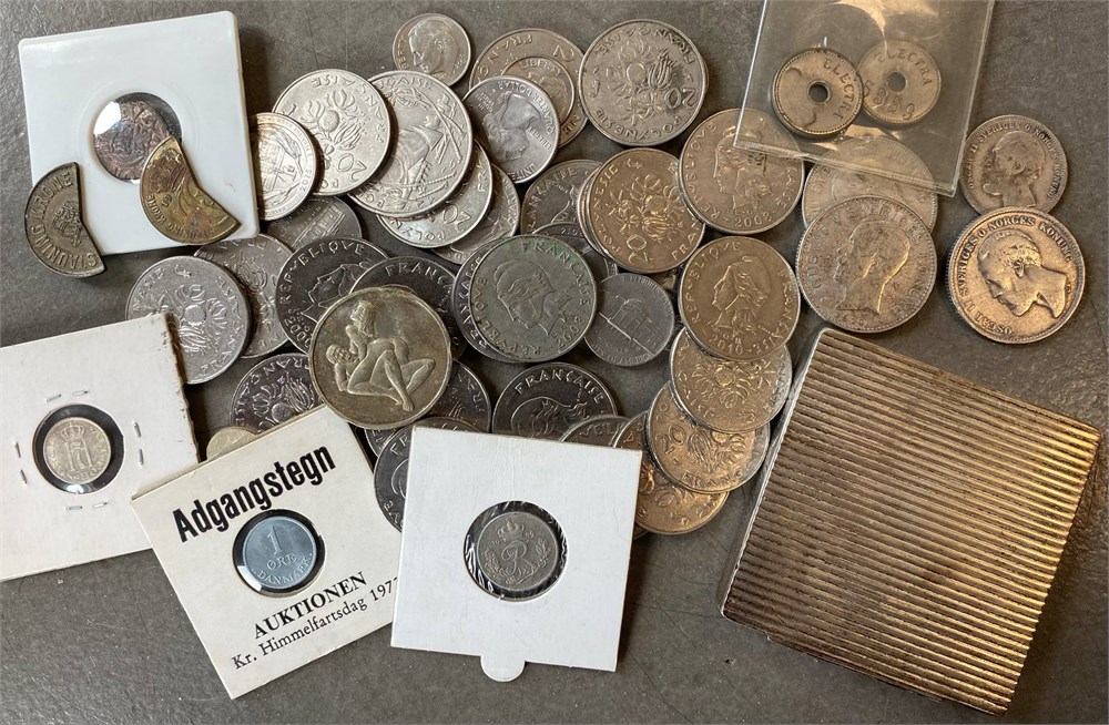 Samling, incl. 10 øre 1959, Stauningkrone (2), svenske 1- og 2 kroner, Ag (4) samt, svensk Estland skilling 1570, en frækkert og en sminkeæske m. spejl.