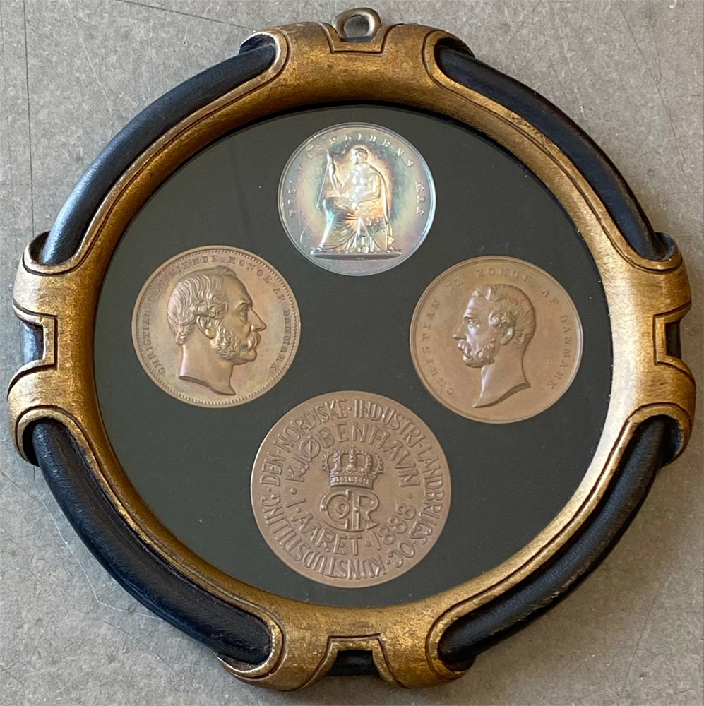 Fire indrammede medaljer inkl. Dansk Husflidsselskab, u. år (1878), Ag, 42 mm; Fyens Industri- og Landbrugsudstilling, 1885, Ae, 43 mm; Den Nordiske Industri-, Landbrugs- og Kunstudstilling i København, 1888, Ae, 51 mm. (4)