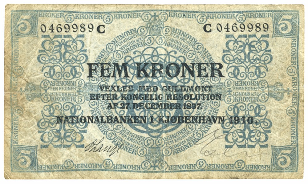 5 kroner 1910 C, nr. 0469989, V. Lange / Olsen.