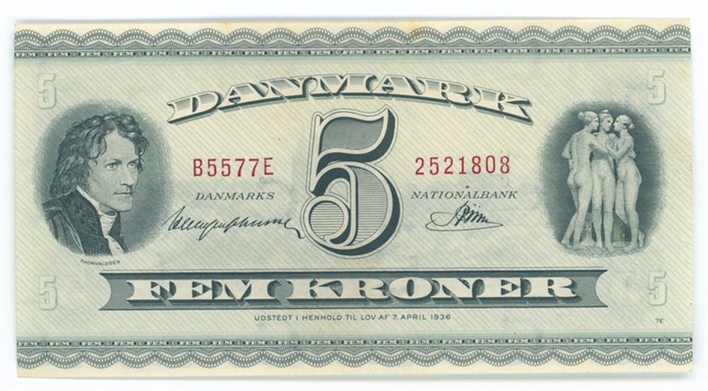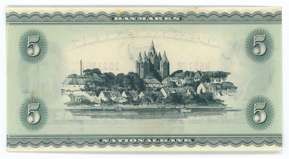5 kroner 1957 B5, nr. 2521808, Haugen Johansen / Riim.