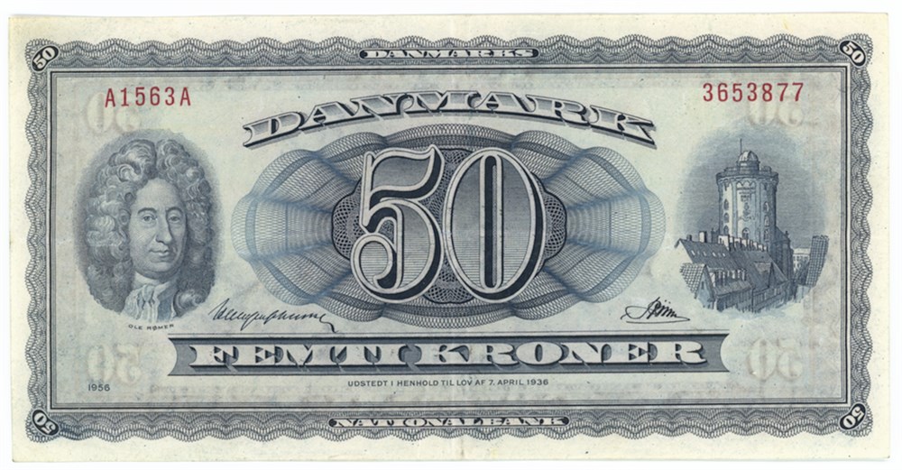 50 kroner 1956 A1, nr. 3653877, Haugen Johansen / Riim.