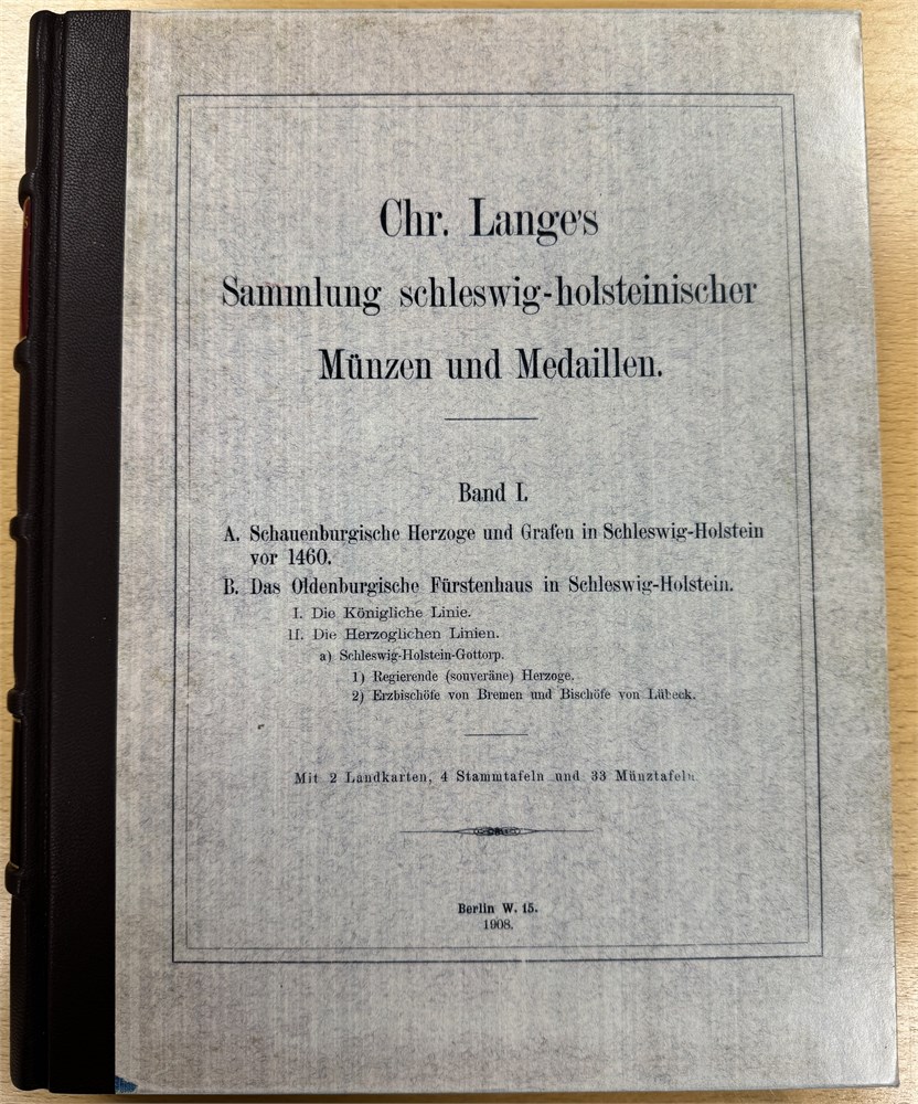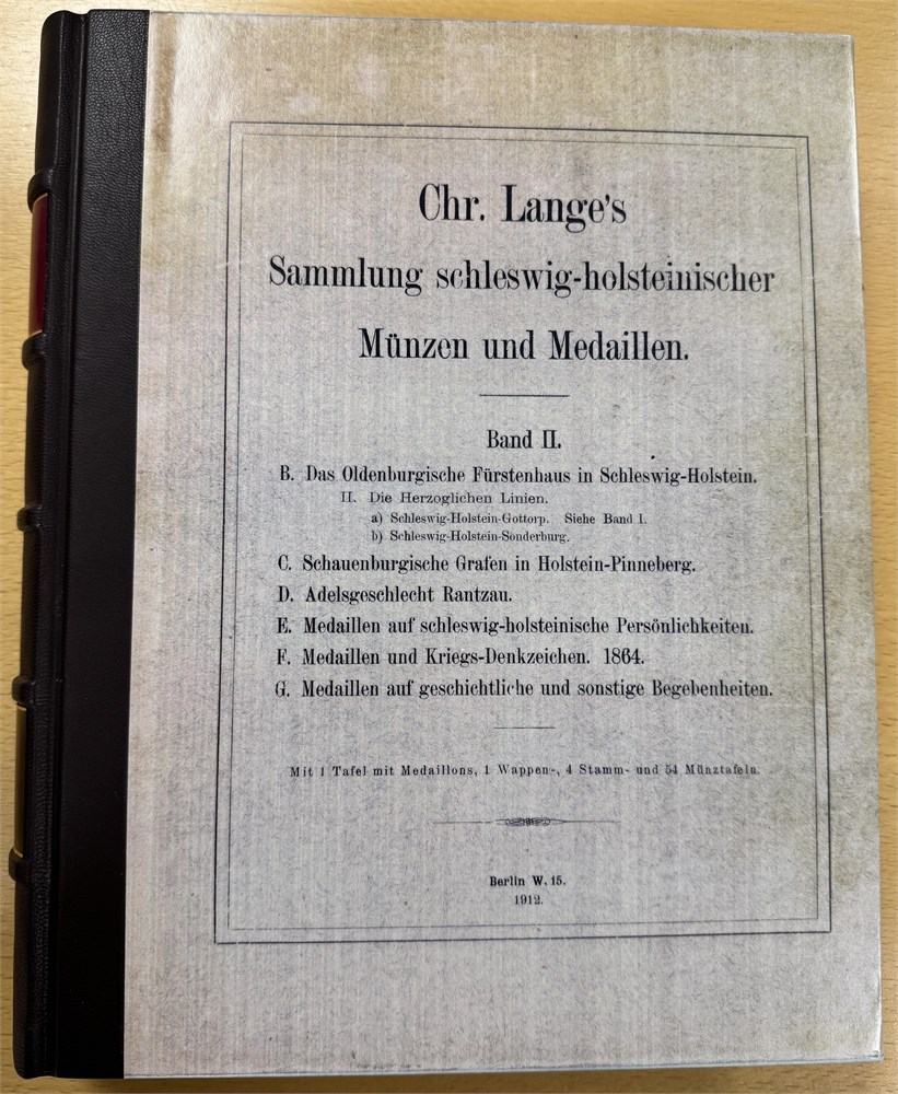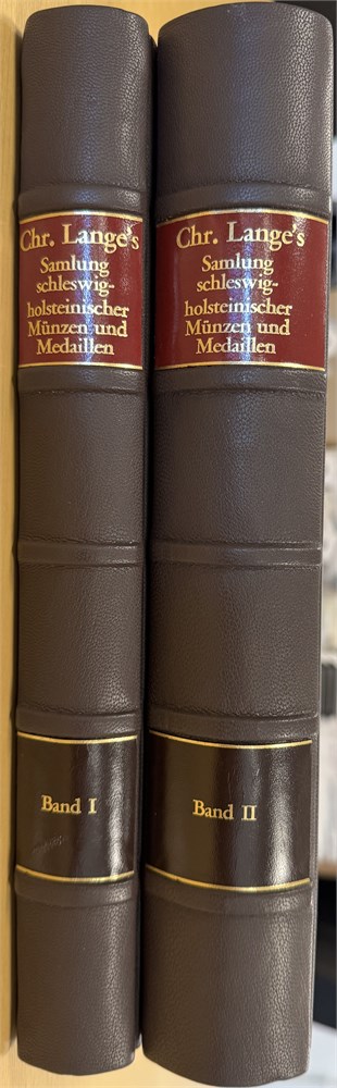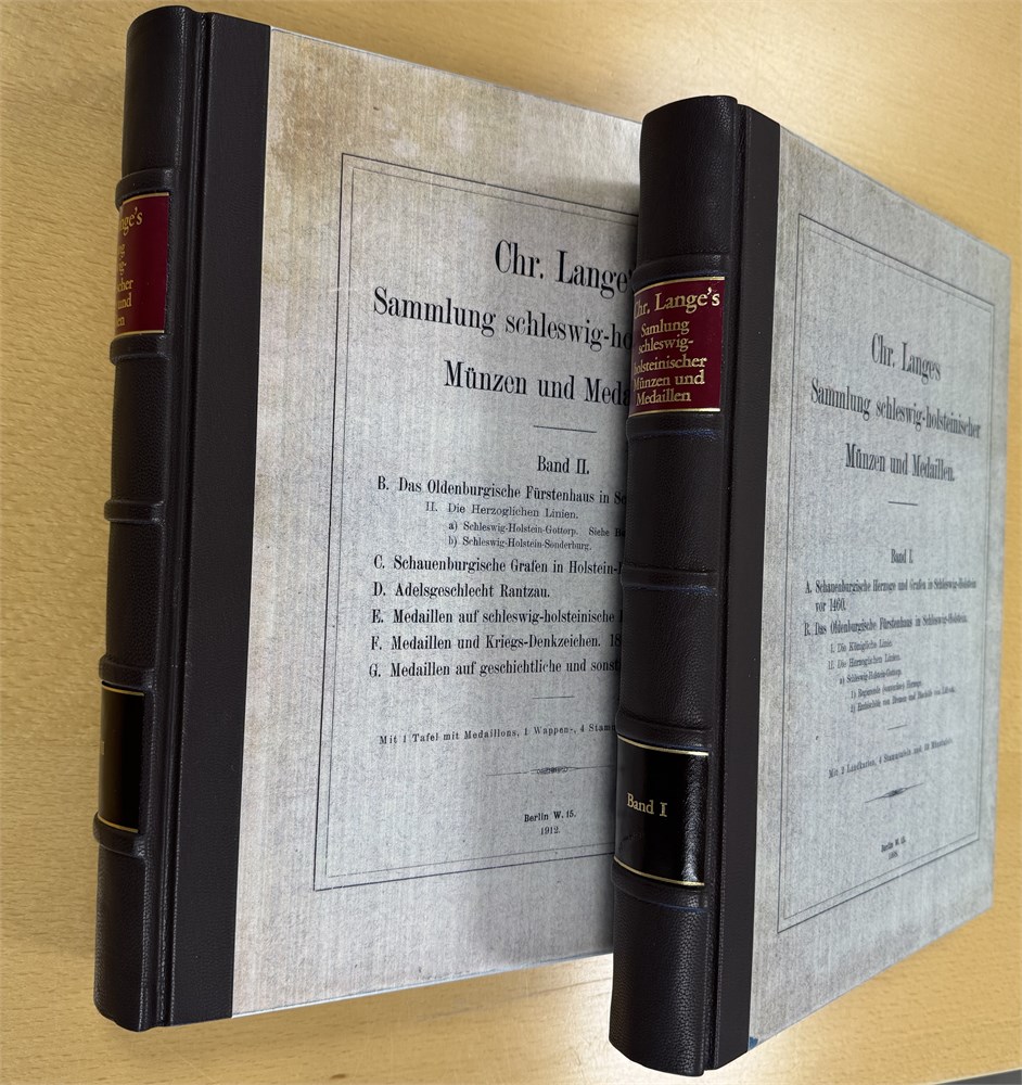 Chr. Lange's Sammlung schleswig-holsteinischer Münzen und Medaillen, 1908+1912. Pæn stand i flot nyindbundet halvlæder. (2)