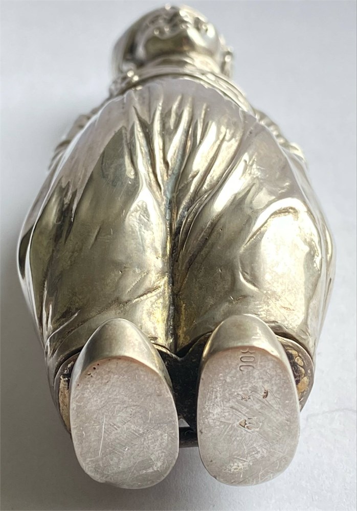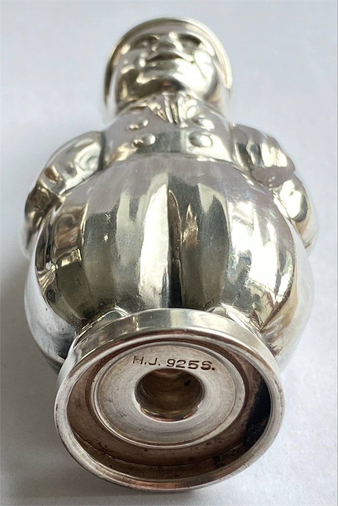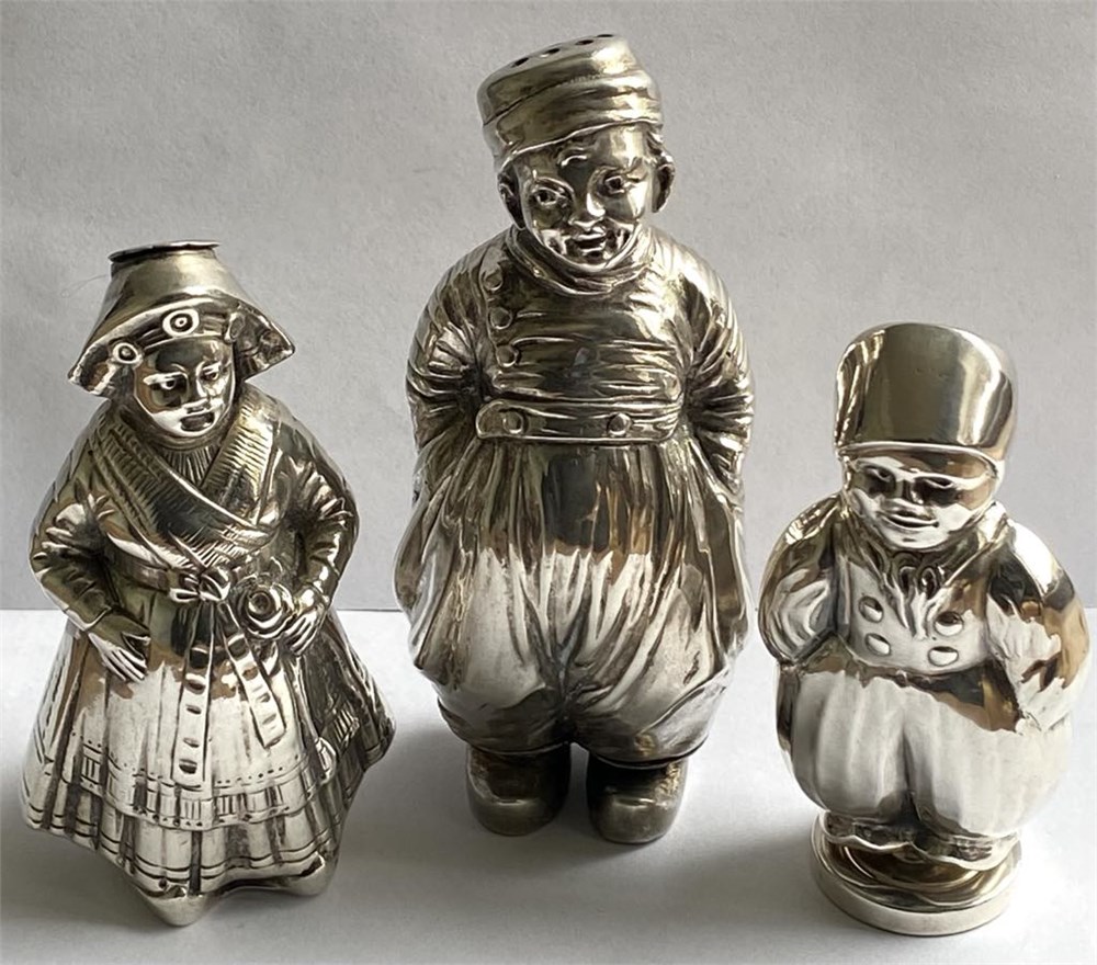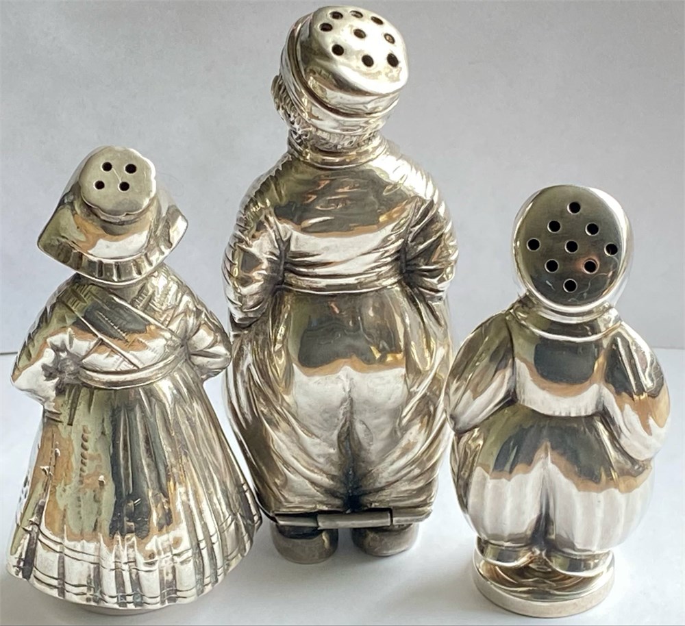 Salt og peber figurer, Ag, mand (800/1000), dame (830/1000) og barn (925/1000), bunden af manden er antageligvis udført i forsølvet messing.