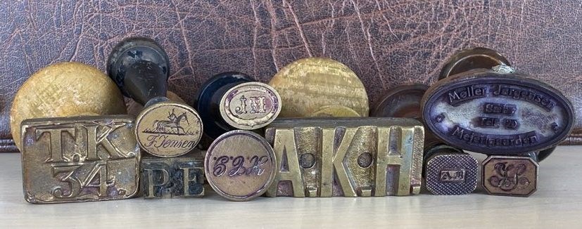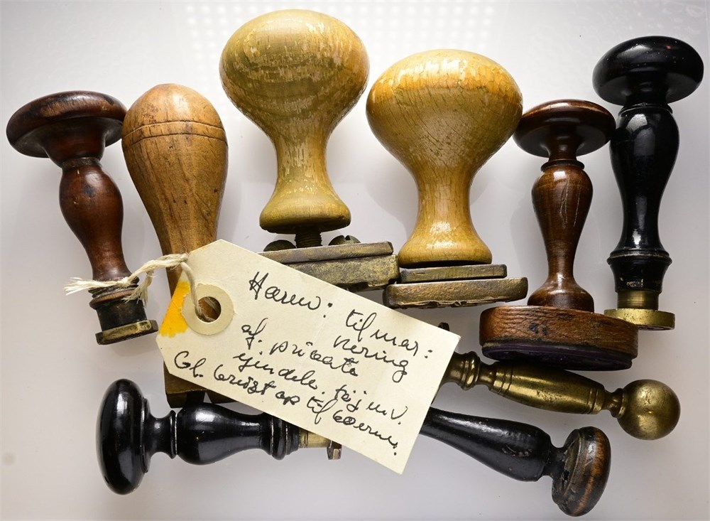 Samling ældre danske signeter af træ og metal. Blanding af private, 'offentlige' og erhvervsmæssige. Primært med initialer og forkortelser. (9)