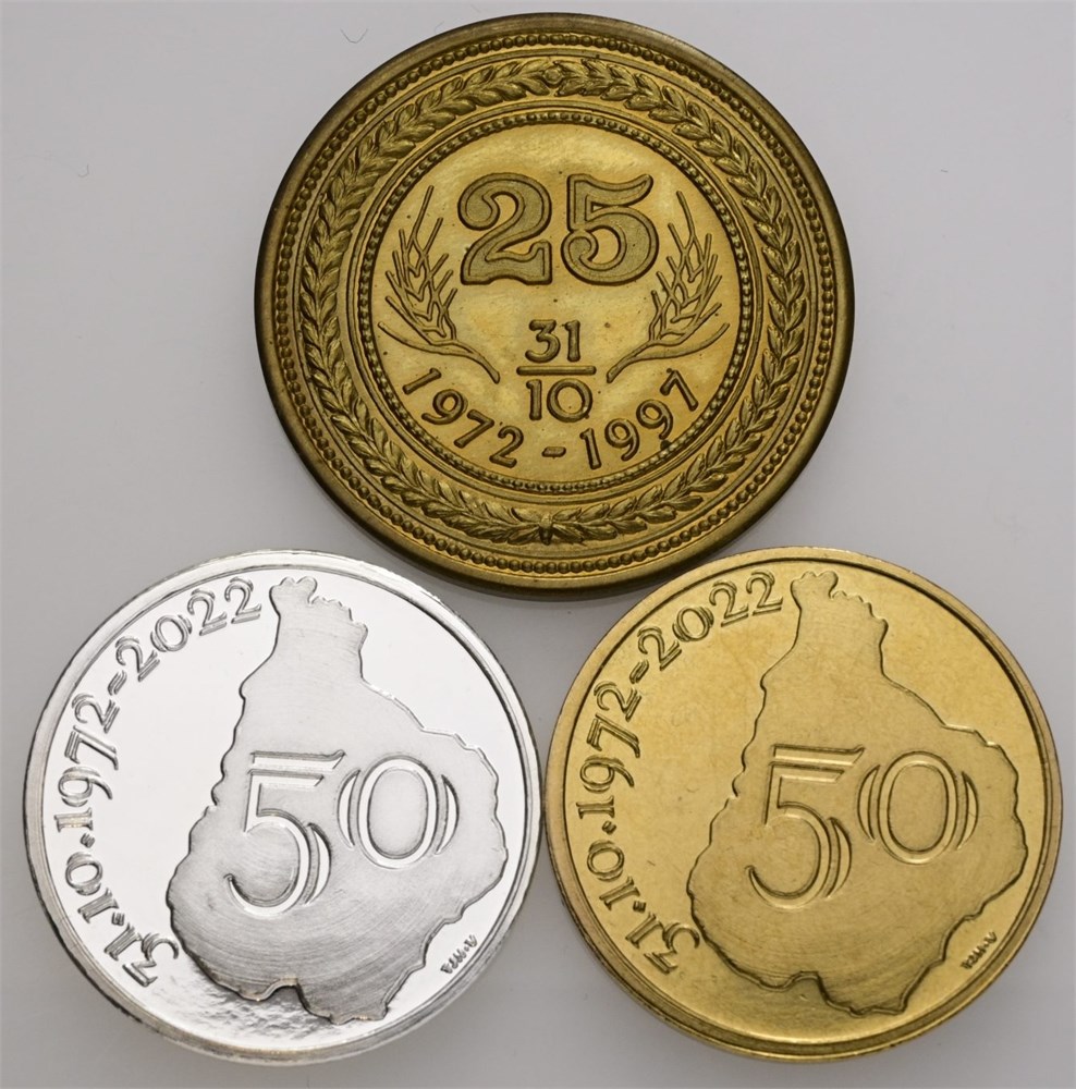 Amagerlands Numismatiske Forening, 25 års jubilæum 1997, Ae, 36 mm, 16,14 g; 50 års jubilæum 2022, Ag, 30 mm, 17,94 g, Ae, 30 mm, 13,12 g. (3)
