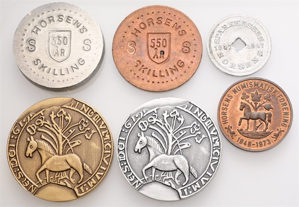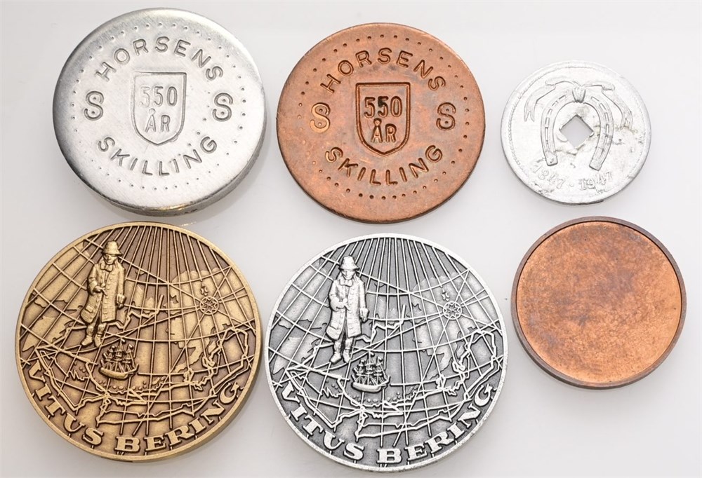 Sparekassen Horsens, 100 års jubilæum, 1947, Al, 22 mm, 0,85 g; Horsens numismatiske forening, 25 års jubilæum, 1973, Ae, 25 mm, 8,13 g; Vitus Bering, 1978, Ag (925/1000), 35 mm, 23,13 g, nr. 227/500, Ae, 35 mm, 23,11 g, nr. 105/500; Horsens 550 år, Ae, 30 mm, 7,89 g, Al, 30 mm, 9,51 g. (6)