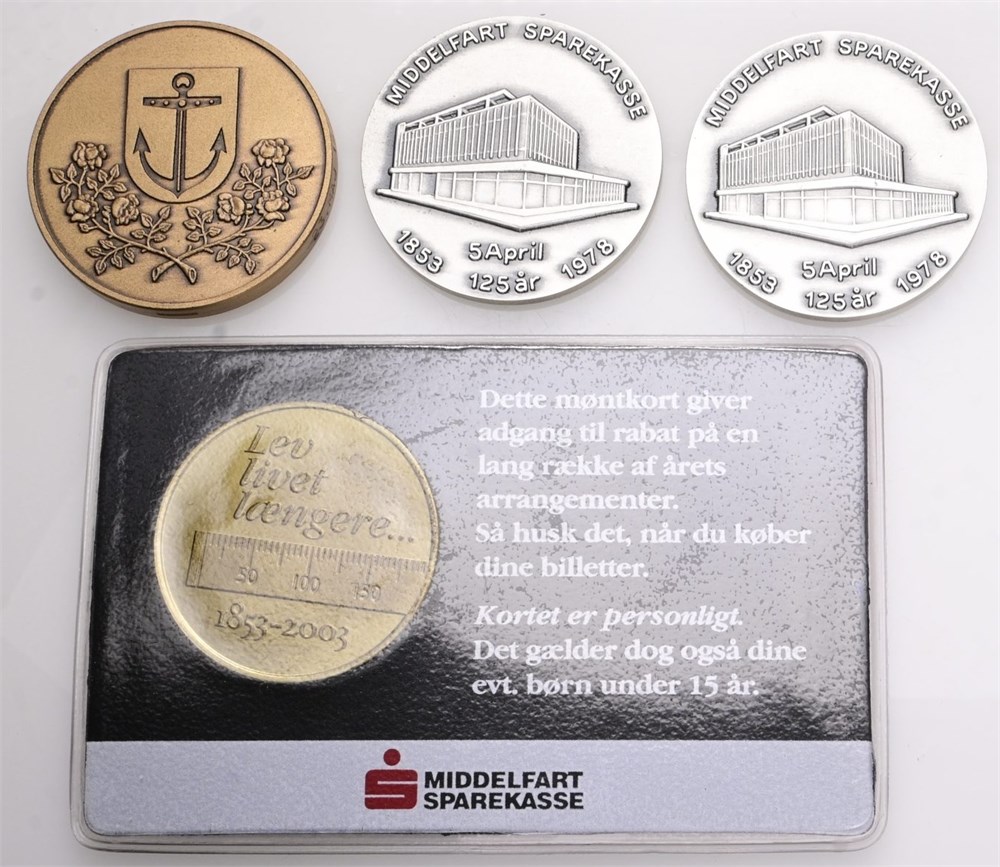 Mariagermønten, 1992, Ae, 35 mm, 26,65 g; Middelfart Sparekasse, 1978, Ag (925/1000), 34 mm, 19,38 og 19,52 g, nr. 043/500 og 113/500; Middelfart Sparekasse, 2003, Ae, 32 mm. (4)