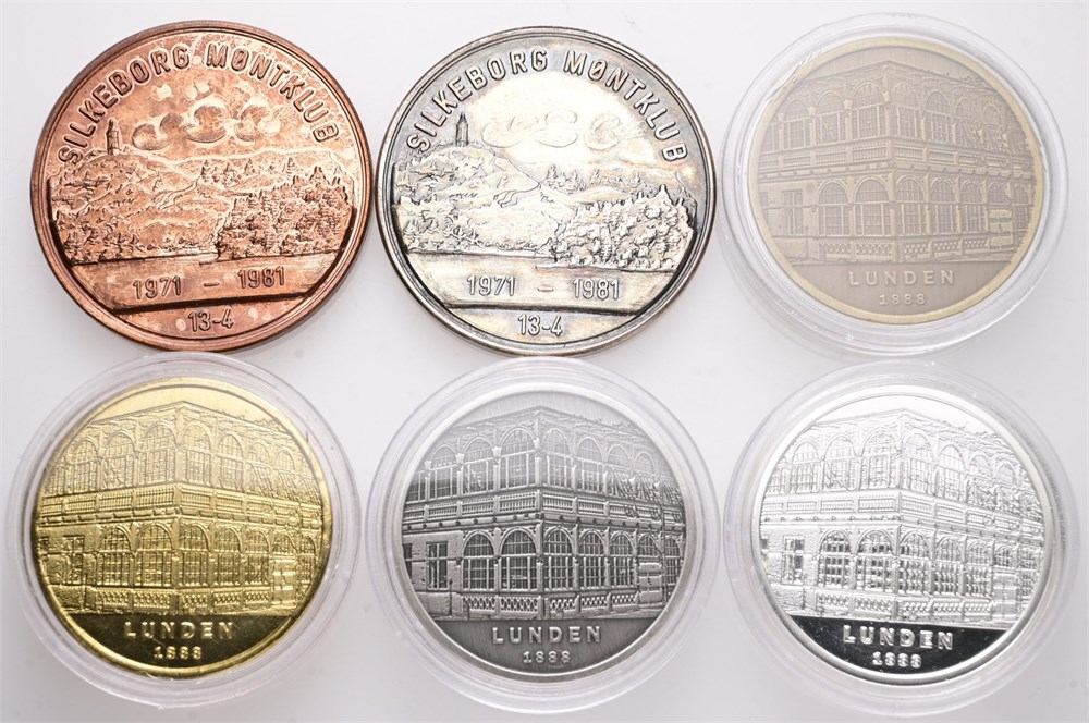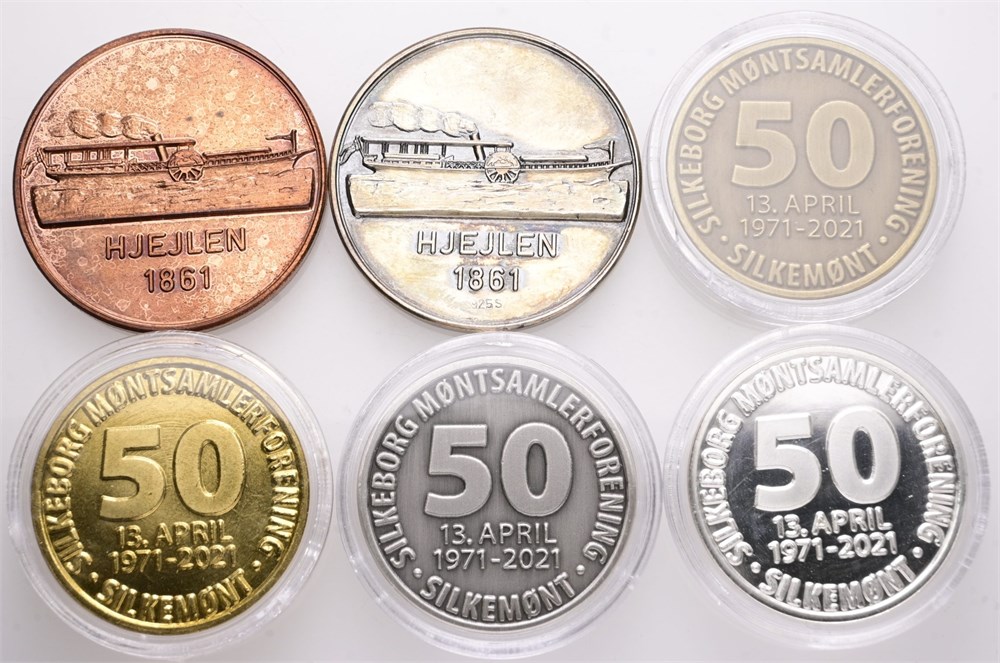 Silkeborg Møntsamlerforening, 1981, Ag (925/1000), 35 mm, 19,80 g, Ae, 35 mm, 20,43 g, 2021, Ag (blank), 30 mm, 18,32 g, Ag (mat), 30 mm, 18,15 g, Ae (blank), 30 mm, 13,16 g, Ae (mat), 30 mm, 13,06 g. (6)