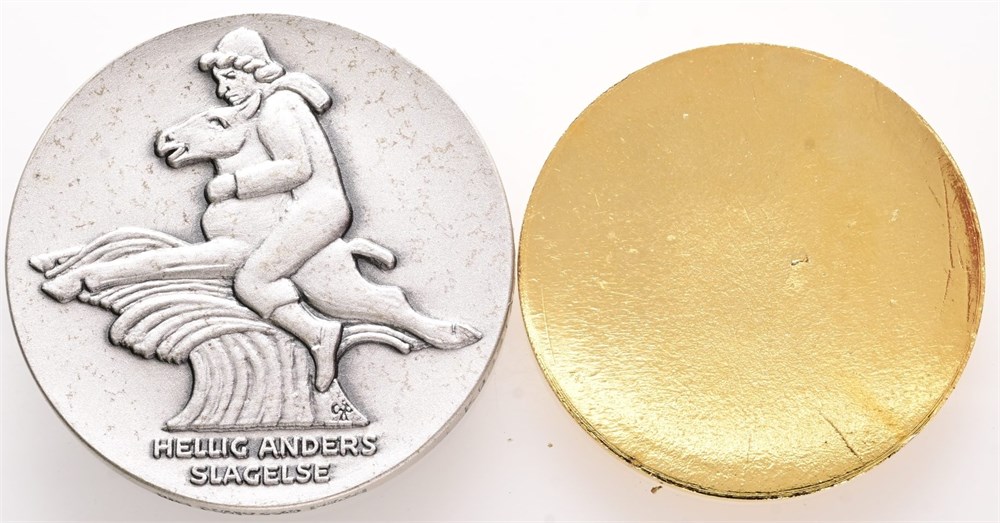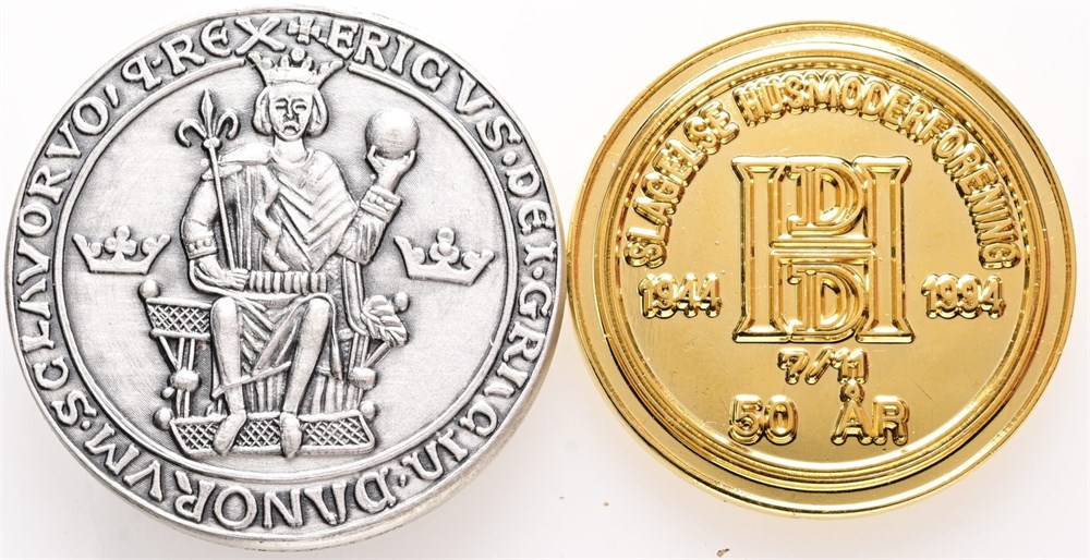 Slagelse, købstad i 700 år, 1988, Ag (925/1000), 35 mm, 30,27 g; Slagelse Husmoderforening, 1994, forgyldt Ae, 32 mm, 9,74 g. (2)