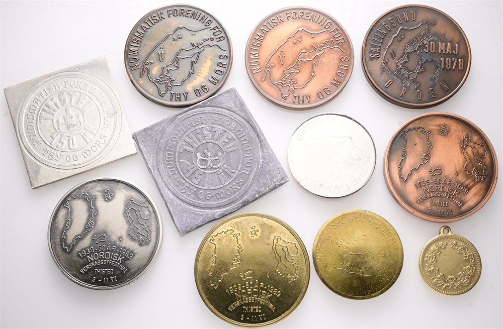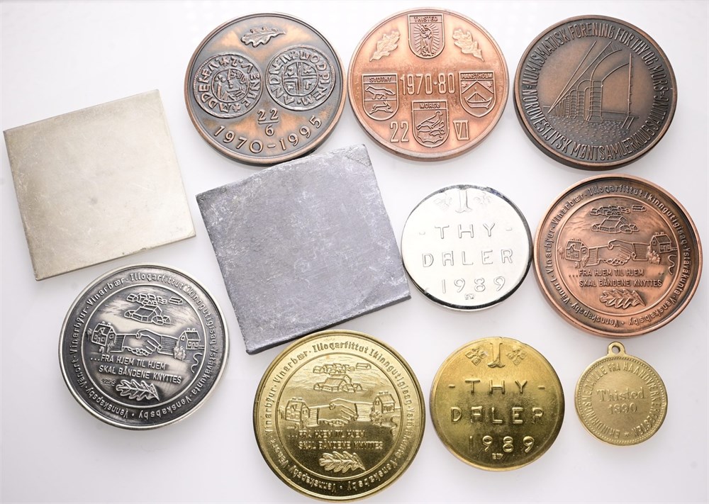 Håndværkerfesten i Thisted, 1890, Ae, 22 mm, 4,72 g; Nordisk Venskabsfestival i Thisted, 1989, Ag (925/1000), 40 mm, 26,43 g, Cu, 40 mm, 27,89 g, messing, 40 mm, 26,11 g; Numismatisk forening for Thy og Mors, (1974), Ag, 40 mm, 24,46 g, Pb, 42 mm, 1978, Ae, 40 mm, 33,35 g, 1980, Ae, 40 mm, 27,88 g, 1995, Ae, 40 mm, 27,90 g; Thy Daler, 1989, Ae, 32 mm, 19,01 og 19,15 g. (11)