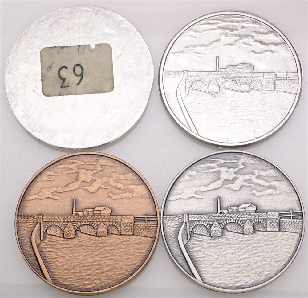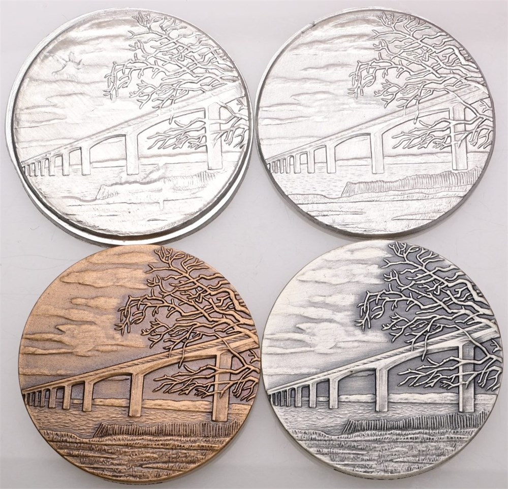 Vejle Mønt, 1980, Ag (925/1000), 35 mm, 32,94 g, nr. 052/250, Ae, 35 mm, 31,04 g, tvesidigt (prøve-)afslag, Al, 36x35 mm, 5,19 g, ensidigt (prøve-)afslag af forsiden, Al, 38x37 mm, 5,19 g. (4)