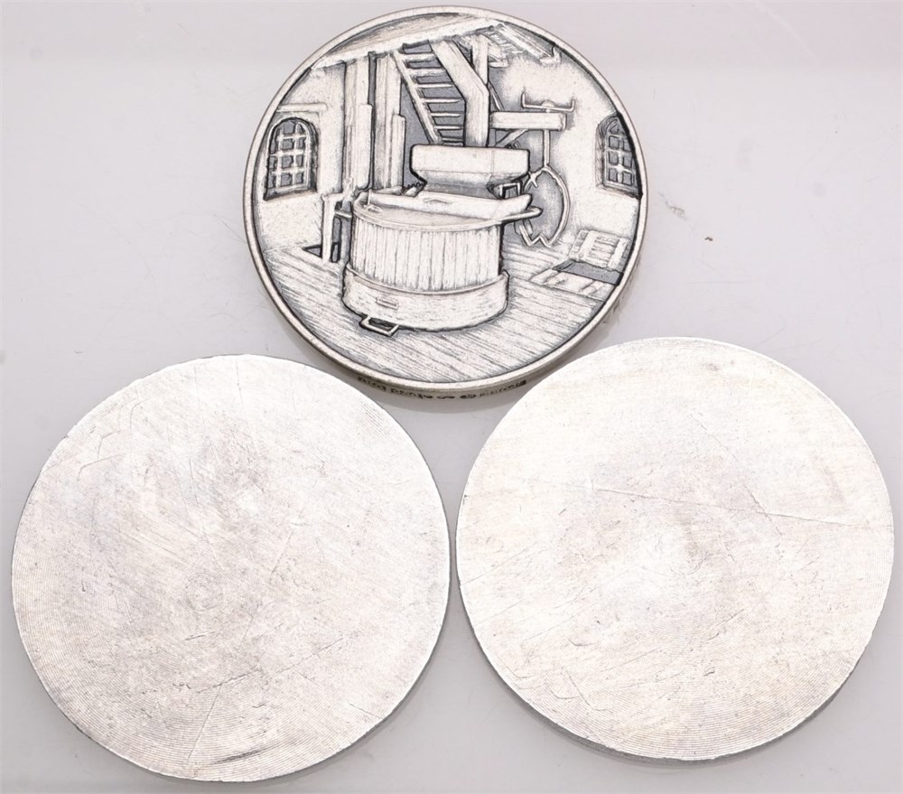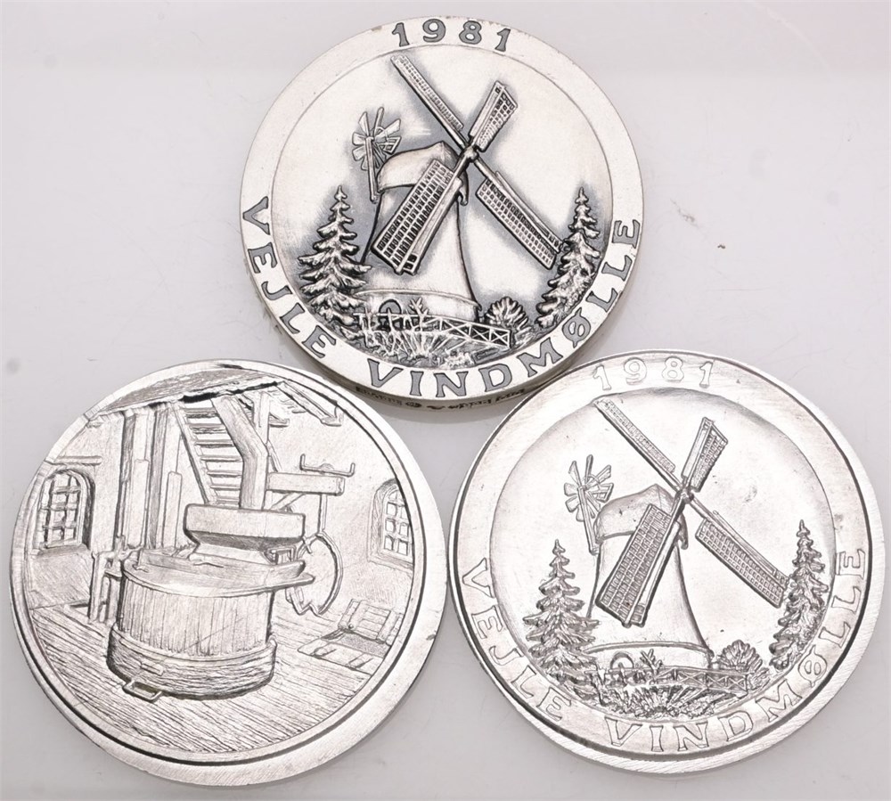 Vejle Mønt, 1981, Ag (925/1000), 35 mm, 31,42 g, nr. 052/300, ensidigt (prøve-)afslag af forsiden, Al, 37 mm, 5,18 g, ensidigt (prøve-)afslag af bagsiden, Al, 37 mm, 5,23 g. (3)