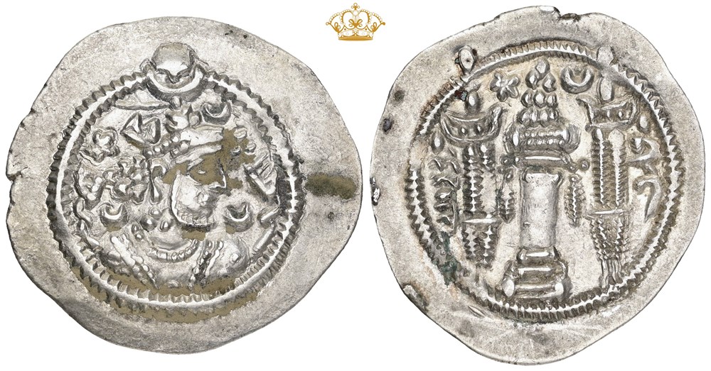 Drachm. Crowned bust right / Fire altar; attendants flanking.