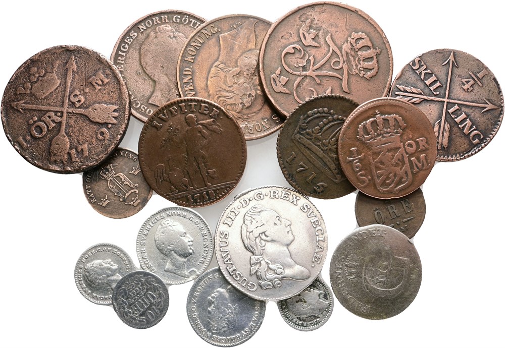Samling inkl. 1/6 öre 1718; daler 1715, 1718; 1/6 riksdaler 1788, monteringsspor. I alt 17 stk.