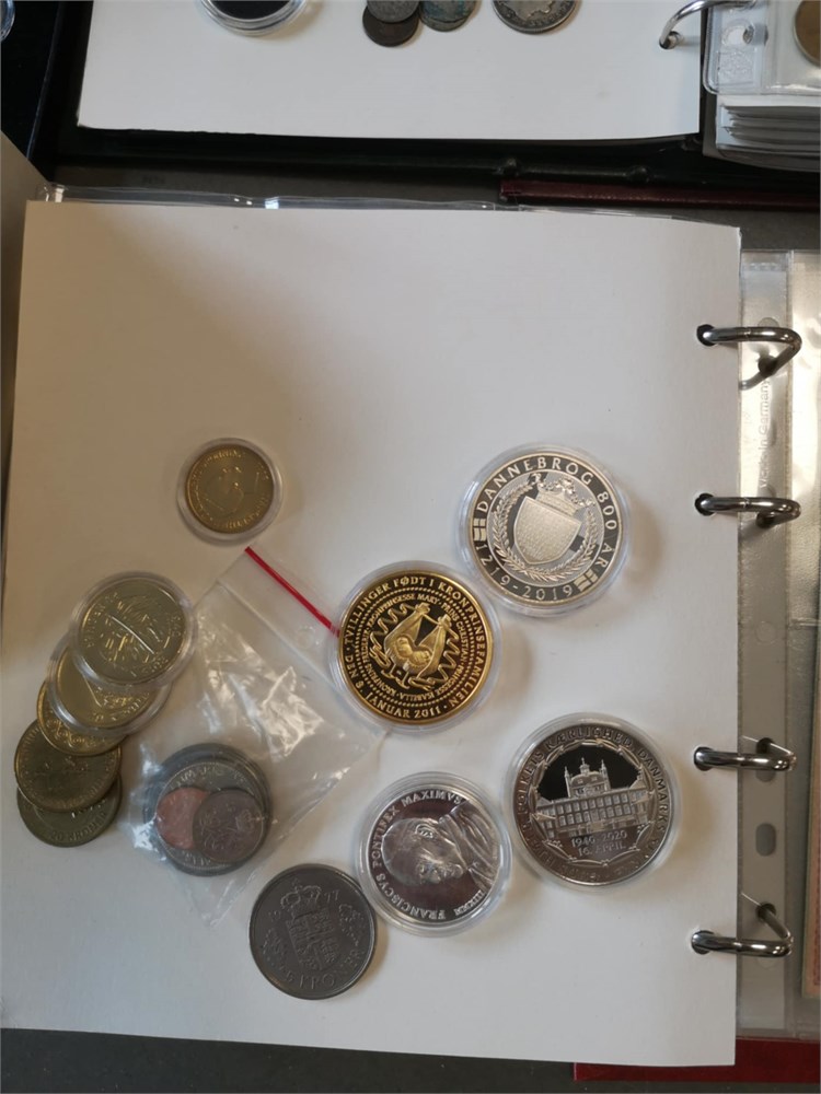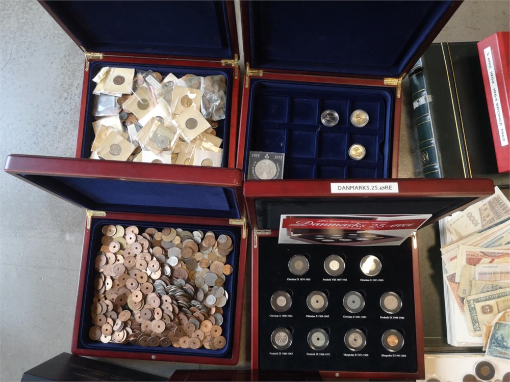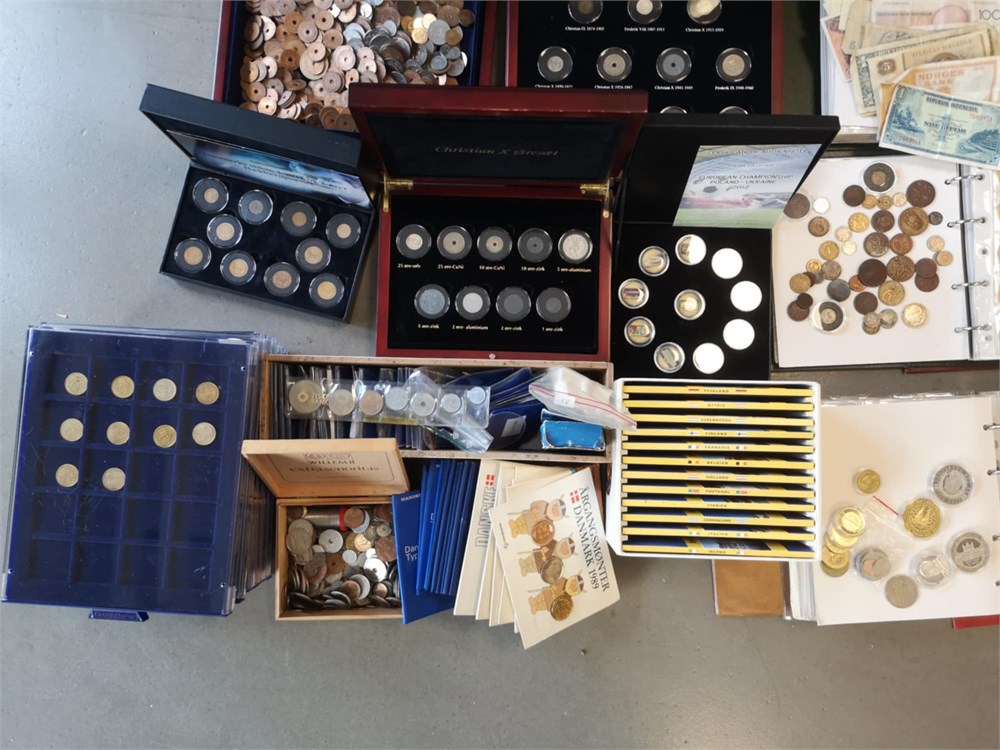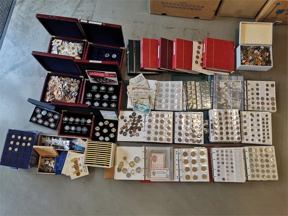 'Verden', samling inkl. Danmark, skilling 1719; 1/2 rigsdaler 1854; 1 krone 1935, 1959, 1990 (prøvemønt); 2 kroner 1924, 1959, 1990 (prøvemønt); sættet "Danmarks 25-ører", "Christian X øresæt", Hækkerup møntsæt; Euro møntsæt fra 12 forskellige lande. Derudover ca. DKK 1.800,- i mønter inkl. 'gule' 1 og 2 kroner. I alt ca. 60 kg inkl. tilbehør.
