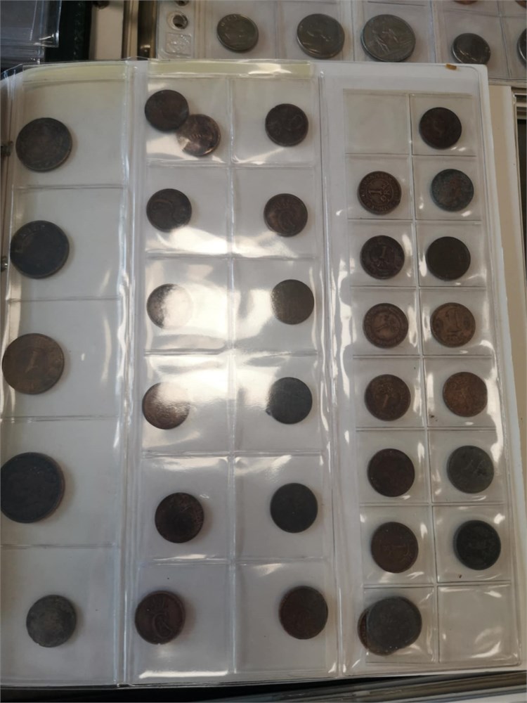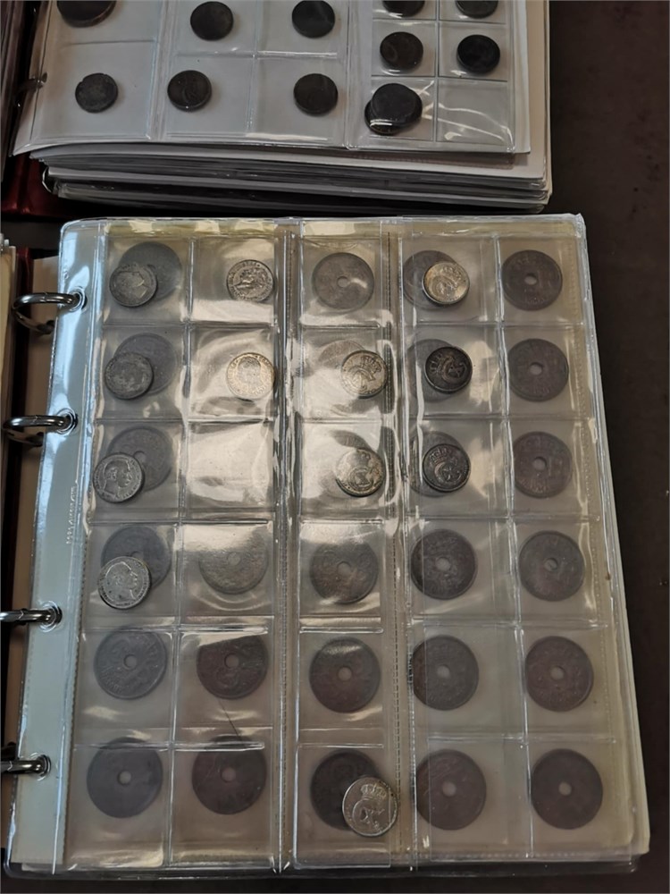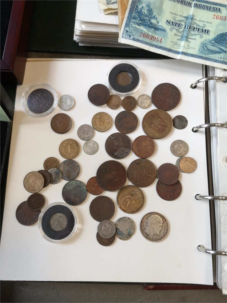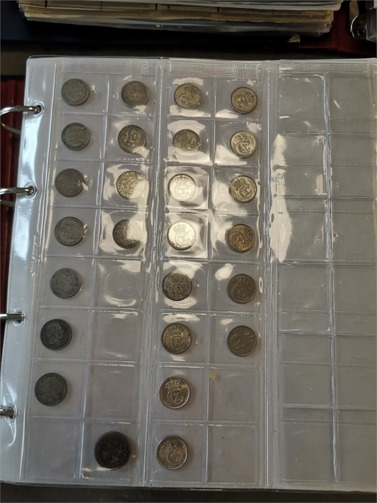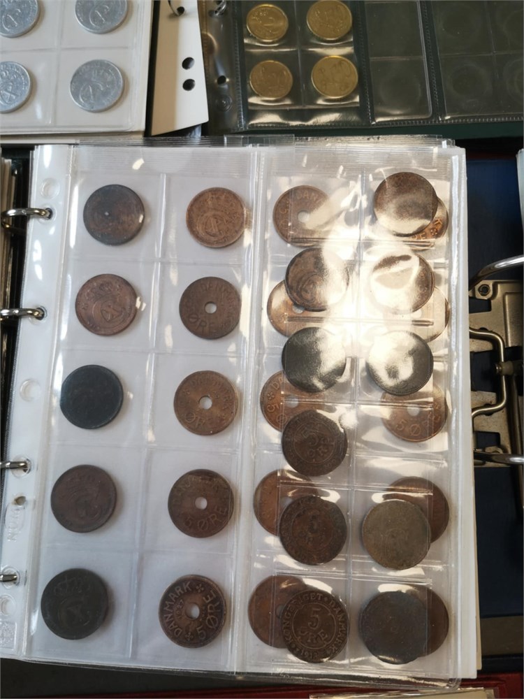 'Verden', samling inkl. Danmark, skilling 1719; 1/2 rigsdaler 1854; 1 krone 1935, 1959, 1990 (prøvemønt); 2 kroner 1924, 1959, 1990 (prøvemønt); sættet "Danmarks 25-ører", "Christian X øresæt", Hækkerup møntsæt; Euro møntsæt fra 12 forskellige lande. Derudover ca. DKK 1.800,- i mønter inkl. 'gule' 1 og 2 kroner. I alt ca. 60 kg inkl. tilbehør.