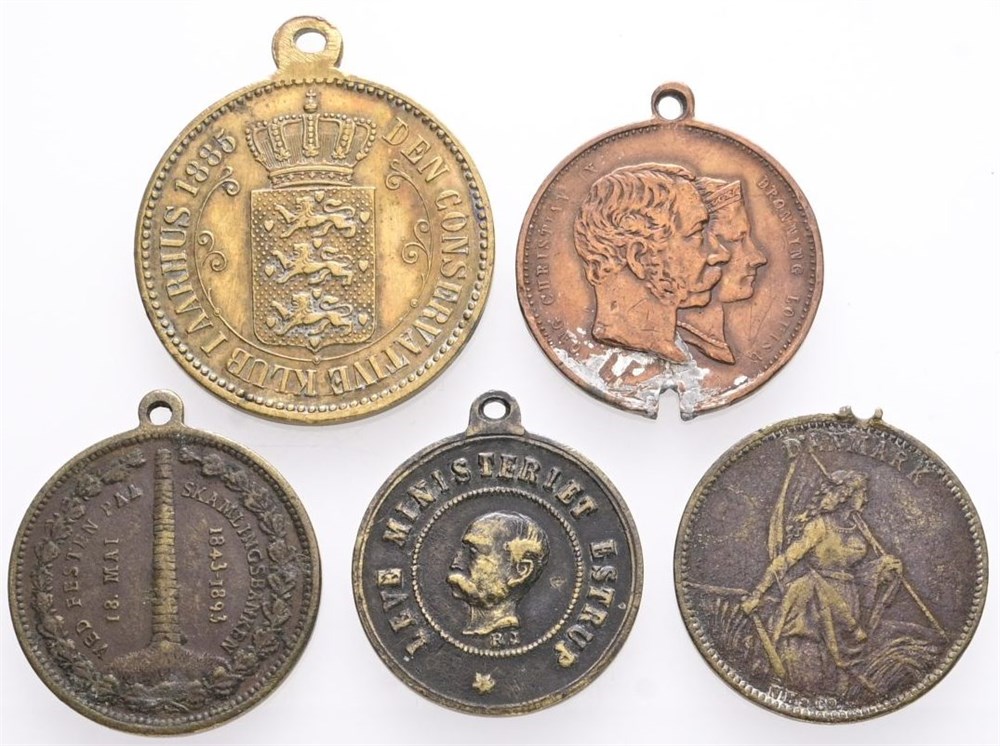 Lille samling medaljer, Den Conservative Klub i Aarhus, 1885, Ae, 28 mm, 8,56 g; Leve Ministeriet Estrup, 1887, Ae, 22 mm, 5,01 g; Guldbrylluppet, 1892, Ae, 24 mm, 4,77 g; Guldbrylluppet, 1892, Ae, 24 mm, 5,19 g; Festen på Skamlingsbanken, 1893, Ae, 24 mm, 5,26 g. (5)