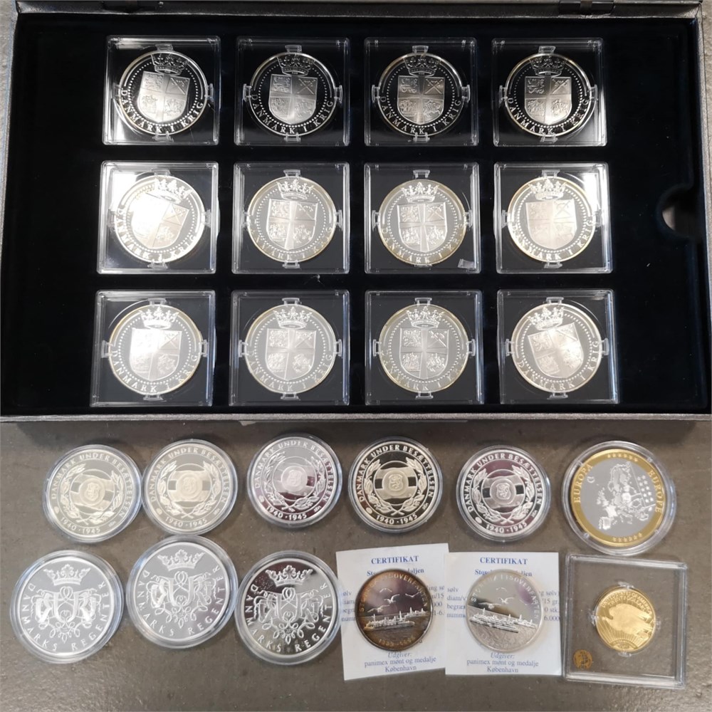 Medaljer fra serien "Danmark i Krig", Ag (925/1000), 20 g pr. stk. (12); "Danmark under Besættelsen", Ag (925/1000), 27 g pr. stk. (5); "Danmarks Regenter", Ag (925/1000), 31 g pr. stk. (3); "Europa", Ag (999/1000), 20 g; kopi af USA, 20 Dollars 1933, Ag (999/1000), 10 g; Storebæltsmedaljen, 1998, Ag (925/1000), 15 g pr. stk. (2). (24)