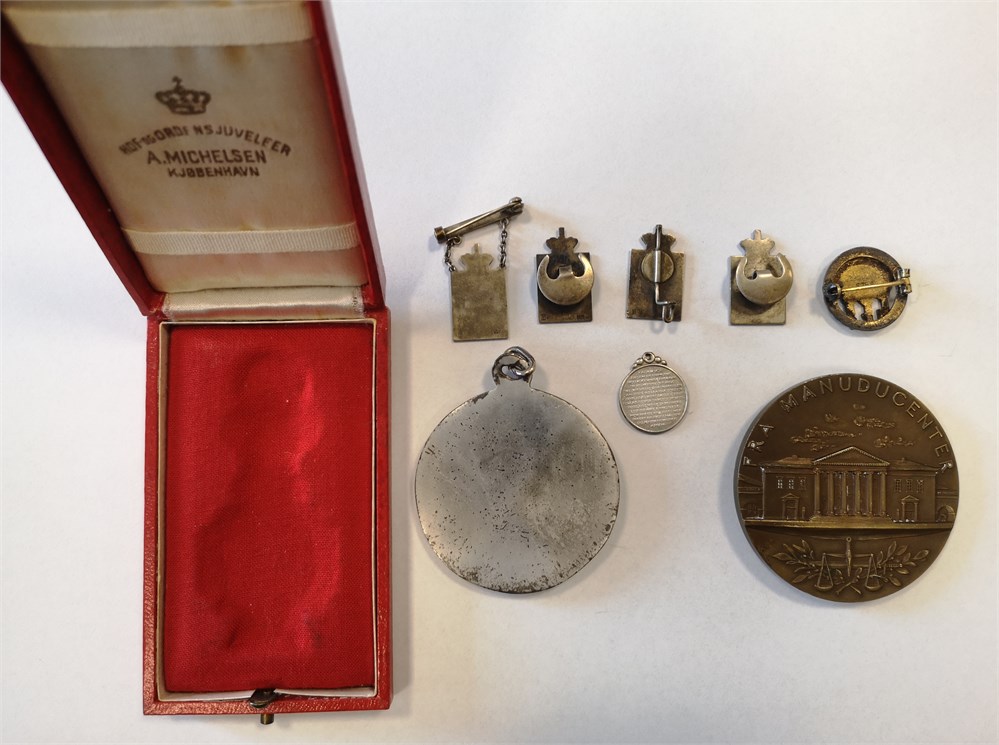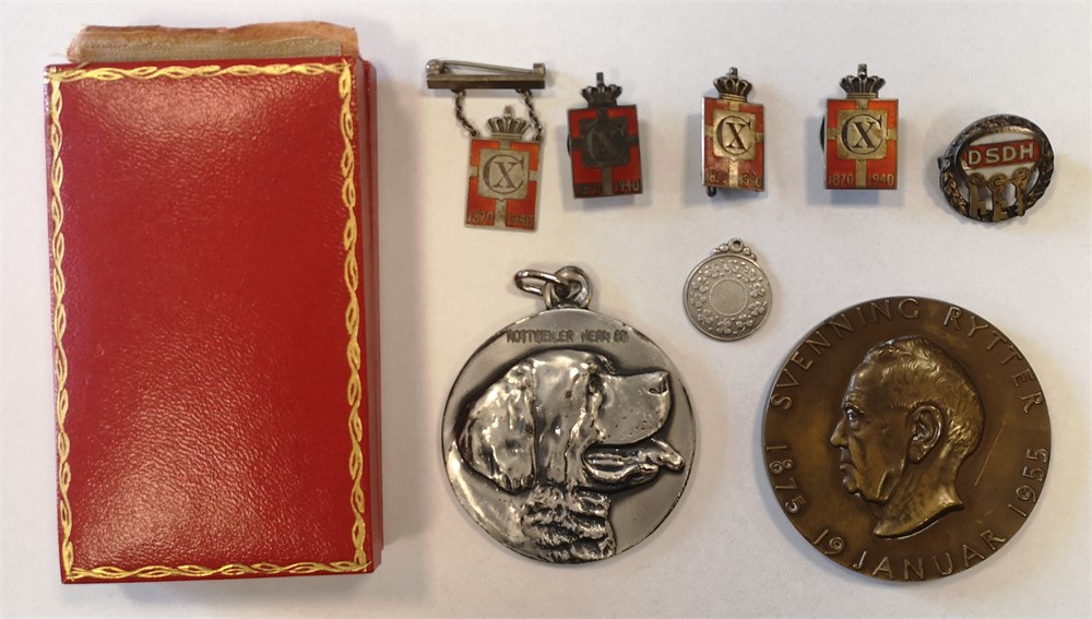 Svenning Rytter, 80 års fødselsdag, 1955, af H. Salomon, Ae, 55 mm; Kongemærke 1940 (4 stk., heraf den ene med knækket nål); DSDH, Ag, 21 mm, 4,45 g; Fader Vor, Ag, 17 mm, 2,65 g; rottweiler, Ae, 50 mm; æske til ridderkors eller dannebrogsmændenes hæderstegn, defekt. (9)