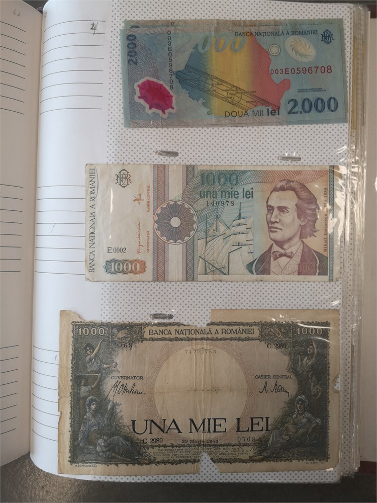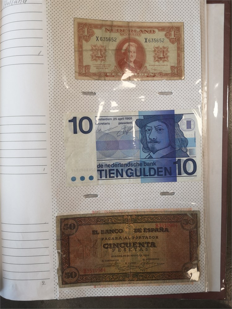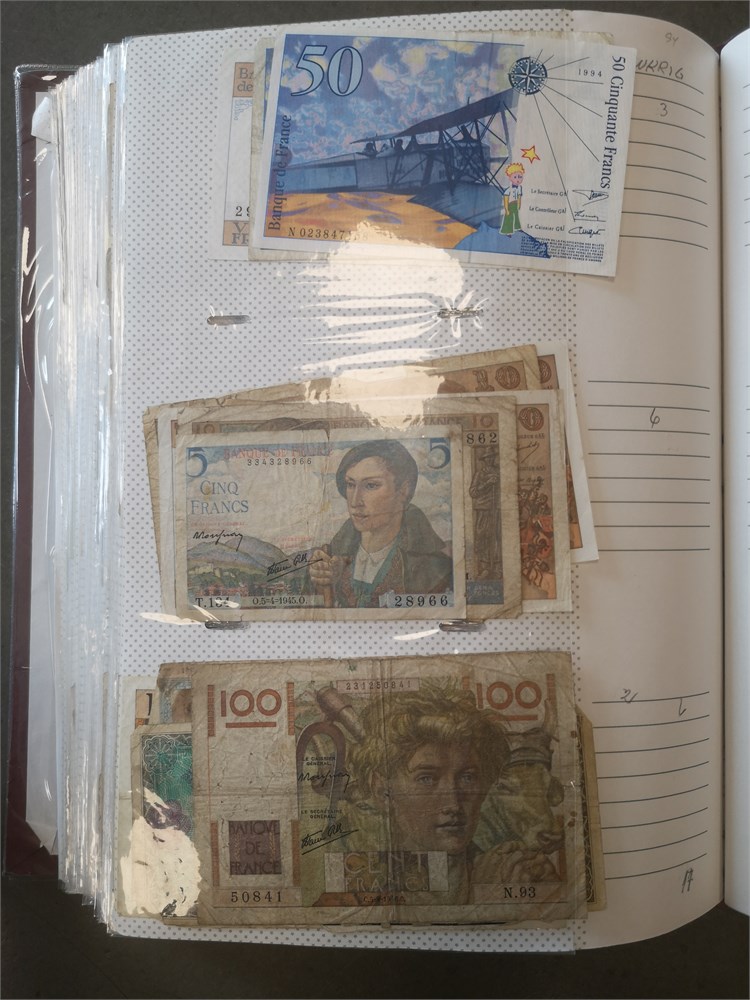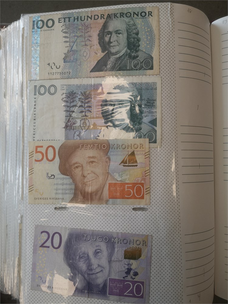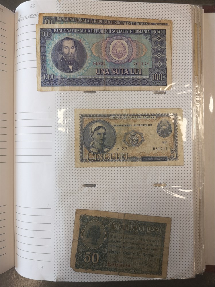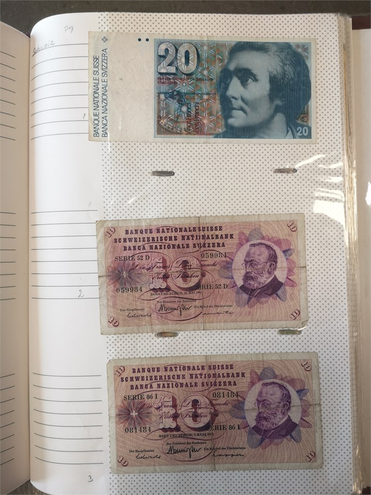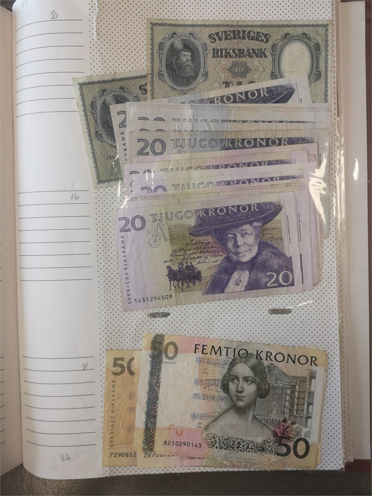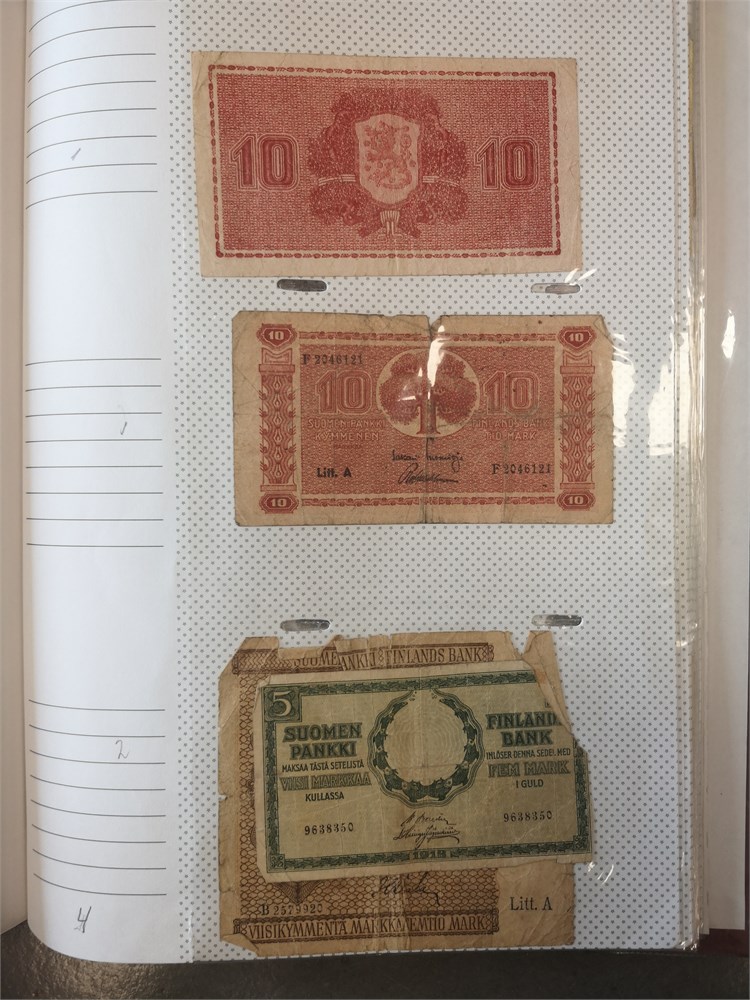 Collection paper money in album incl. Argentina, Austria, Belgium, Chile, Estonia, Finland, France, Iran, Lebanon, Lithuania, Luxembourg, Peru, Poland, Romania, Spain, Sweden and Switzerland. In total c. 680 pcs.