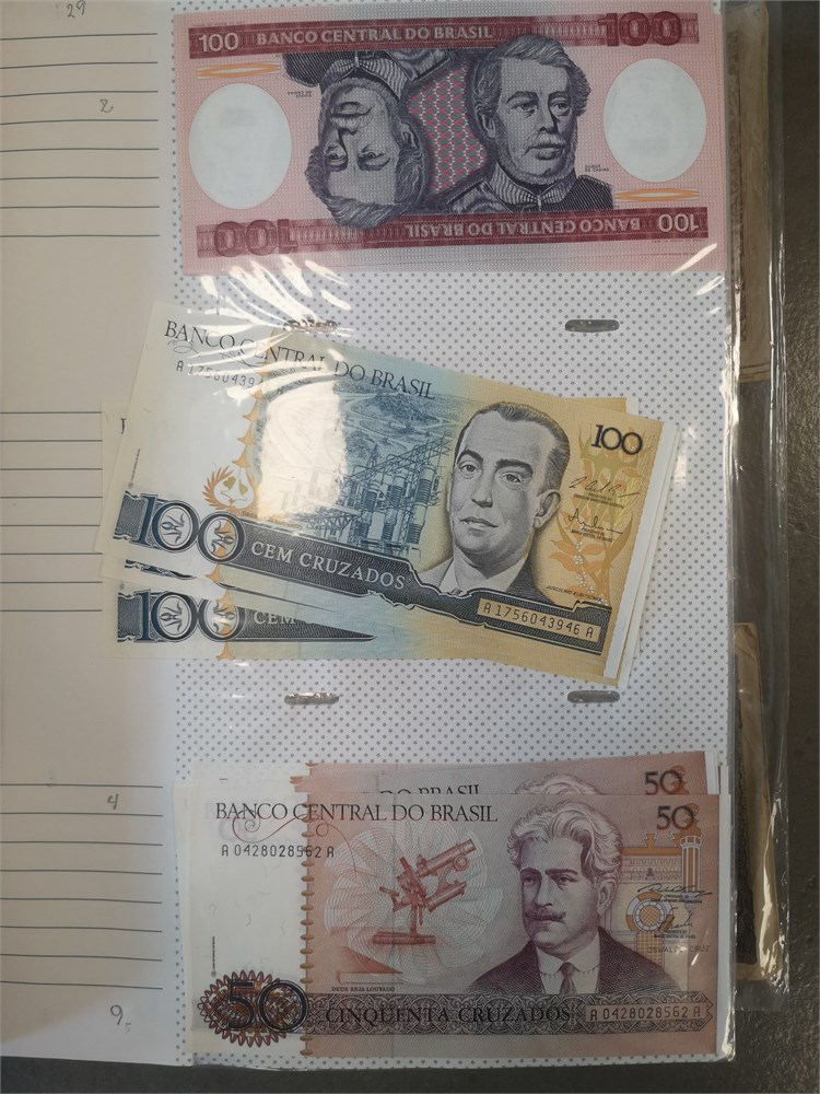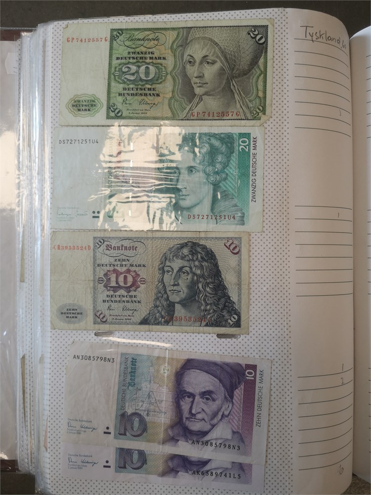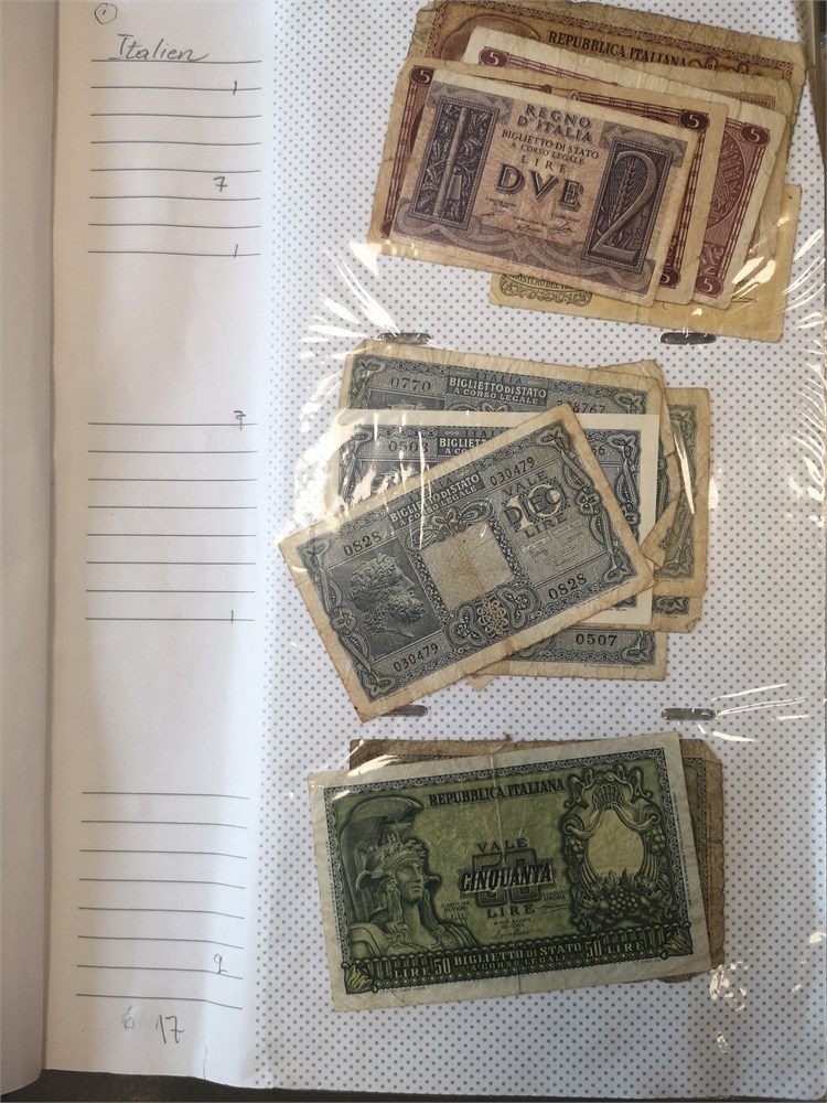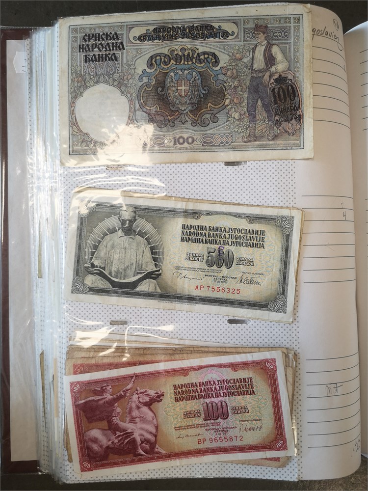 Collection paper money in album incl. Australia, Brazil, Bulgaria, Canada, England, Germany, Greece, Ireland, Italy, New Zealand, Portugal, Venezuela and Yugoslavia. In total c. 730 pcs.